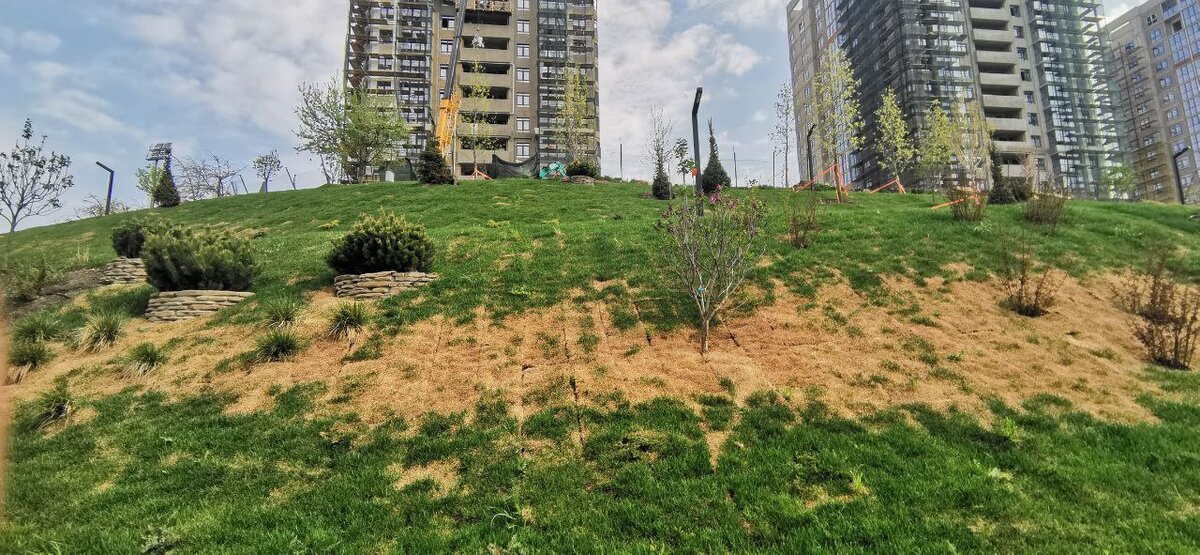 Теперь на северо-восточных ярусах парка вместо скошенной травы постелили рулонный газон.