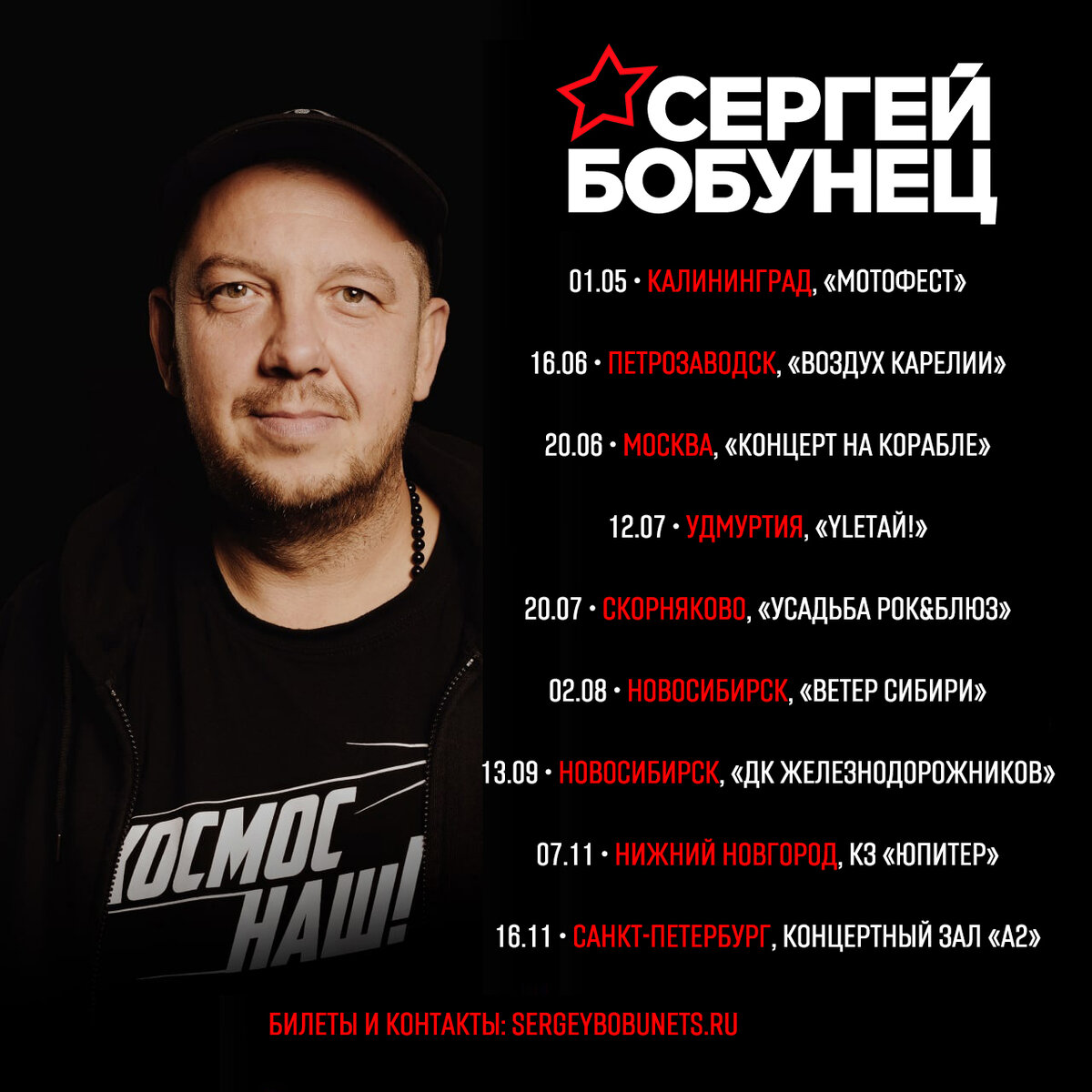 01.05 • КАЛИНИНГРАД, «МОТОФЕСТ» 16.06 • ПЕТРОЗАВОДСК, ФЕСТИВАЛЬ «ВОЗДУХ КАРЕЛИИ» 20.06 • МОСКВА, «КОНЦЕРТ НА КОРОБЛЕ» 12.07 • УДМУРТИЯ, ФЕСТИВАЛЬ «YLETAЙ!» 20.07 • СКОРНЯКОВО, ФЕСТИВАЛЬ «УСАДЬБА РОК&БЛЮЗ» 02.08 • НОВОСИБИРСК, ФЕСТИВАЛЬ «ВЕТЕР СИБИРИ» 13.09 • НОВОСИБИРСК, «ДК ЖЕЛЕЗНОДОРОЖНИКОВ» 07.11 • НИЖНИЙ НОВГОРОД, КЗ «ЮПИТЕР» 16.11 • САНКТ-ПЕТЕРБУРГ, КОНЦЕРТНЫЙ ЗАЛ «А2» БИЛЕТЫ И КОНТАКТЫ: SERGEYBOBUNETS.RU