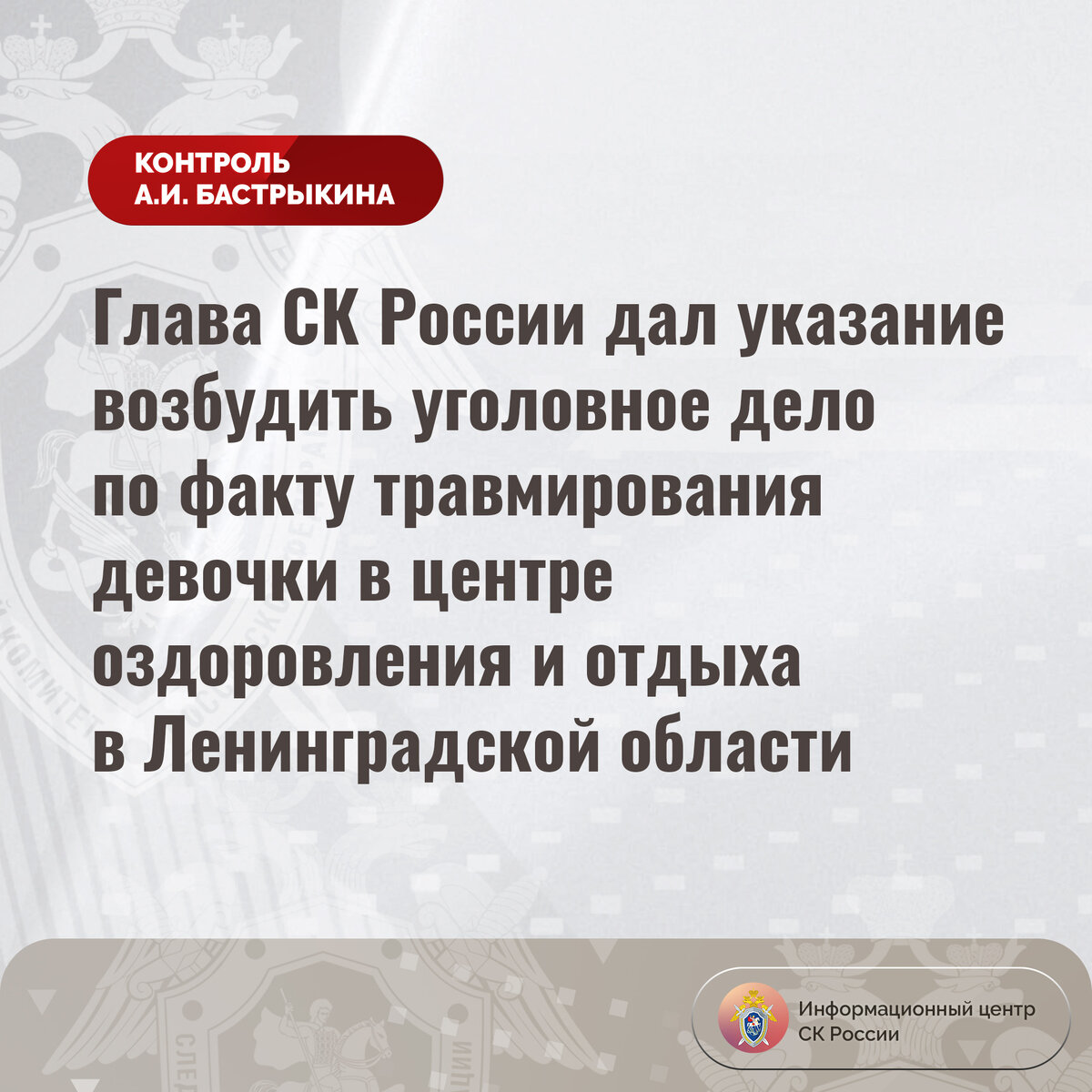 Глава СК России дал указание возбудить уголовное дело по факту травмирования девочки в центре оздоровления и отдыха в Ленинградской области