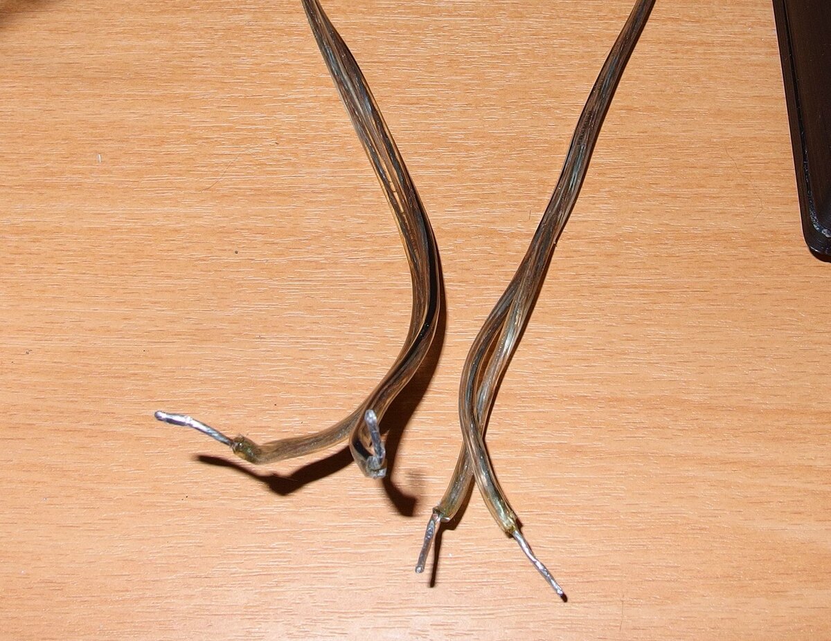 Я весьма долго игнорировал эту тему по причине дикой врождённой лени того, что меня всё устраивало. Когда-то у меня были штатные провода от советских колонок S50, тоненькие и с наглухо интегрированными в них штекерами типа «точка-тире». Потом я решил, что это не круто и купил в местном магазине, торгующим всякой радиолюбительско-электронной хренью (потому что большая часть продаваемого предельно дешёвый китайский ширпотреб и куча старых (но новых :) ) советских радиодеталей), НАСТОЯЩИЕ АКУСТИЧЕСКИЕ ПРОВОДА. Продающиеся на отрез с катушки. В полупрозрачной медового цвета изоляции, одна жила помечена чёрной полоской. Это сейчас я понимаю, что данное китайское изделие ничем не лучше тех самых тонюсеньких советских проводов, разве что всё же потолще, и примерно 1,5 квадрата сечения там, похоже, есть (но не факт, а проверять мне уже не интересно).