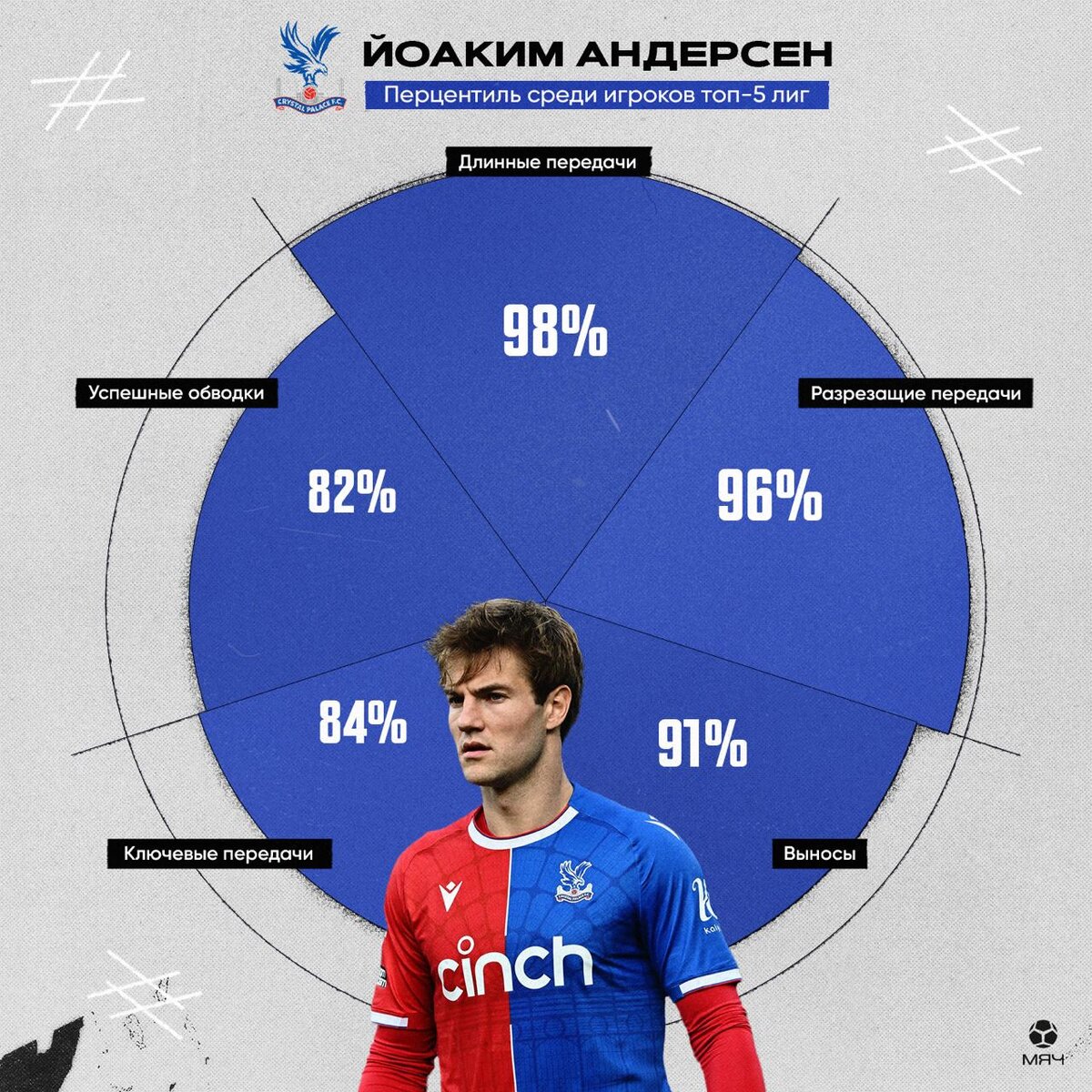 «Надеемся он дорастет до Эмануэля Мамманы или даже Самуэля Умтити», – так говорил спортдир «Лиона» после перехода 22-летнего Йоакима Андерсена в 2019 году. Сейчас звучит смешно, но у Андерсена, в отличие от них, карьера после Франции сложилась и развивается до сих пор – теперь он играет в АПЛ и попадает в «Команду недели». За что попал в «Команду недели»? Оформил сухарь на «Энфилде». 13 (!) выносов, 9/16 точных лонгболлов и даже созданный голевой момент. Андерсен вообще любит кошмарить «Ливерпуль» – в прошлом сезоне спровоцировал на красную карточку Дарвина Нуньеса, после чего получил гору оскорблений от фанатов мерсисайдцев. Чем крут сейчас? У Андерсена уникальный набор качеств. Он на элитном уровне раздает передачи, очень много подключается к атакам, но при этом благодаря своему росту очень нужен в своей штрафной. Андерсен играет центрального в тройке и очень много подчищает в обороне (вспомним те же 13 выносов). В «Кристал Пэлас» его идеально балансирует Марк Геи – скоростной центрбек-диспетчер, который реже обостряет игру и страхует Йоакима при подключениях к атакам. Чего не хватает для топ-уровня? Андерсен периодически ошибается в обороне (вспомнить хотя бы его автогол за 3 минуты против «Вулвз»). Возможно, поэтому Йоаким не закрепился в «Лионе», и после полуфинала ЛЧ поехал перезапускать карьеру в аренду в «Фулхэм». А потом полноценно подписался в Англии с «КП». Что в нем необычного? Уникальный набор качеств Андерсена связан с большой универсальностью на молодежном уровне. Тренер «Мидтьюлланда» развивал качества Йоакима на мяче в опорной зоне и пробовал датчанина в роли центрфорварда – благодаря этому у Андерсена уже 2+2 в этом сезоне, включая победный гол в ворота «МЮ». А еще Йоаким мог перебраться в АПЛ раньше, перейдя в «Арсенал» вместо Давида Луиза. В 2019 году 22-летний Андерсен в составе «Сампдории» Марко Джампаоло остановился в шаге от еврокубков и стал лакомым кусочком на рынке, но выбрал последовательное развитие и «Лион». Андерсену уже 27 – пора бы и в топ-клуб, тем более его который год пытается увести их Южного Лондона в Северный руководство «Тоттенхэма». @myachPRO«Надеемся он дорастет до Эмануэля Мамманы или даже Самуэля Умтити», – так говорил спортдир «Лиона» после перехода 22-летнего Йоакима Андерсена в 2019 году. Сейчас звучит смешно, но у Андерсена, в отличие от них, карьера после Франции сложилась и развивается до сих пор – теперь он играет в АПЛ и попадает в «Команду недели». За что попал в «Команду недели»? Оформил сухарь на «Энфилде». 13 (!) выносов, 9/16 точных лонгболлов и даже созданный голевой момент. Андерсен вообще любит кошмарить «Ливерпуль» – в прошлом сезоне спровоцировал на красную карточку Дарвина Нуньеса, после чего получил гору оскорблений от фанатов мерсисайдцев. Чем крут сейчас? У Андерсена уникальный набор качеств. Он на элитном уровне раздает передачи, очень много подключается к атакам, но при этом благодаря своему росту очень нужен в своей штрафной. Андерсен играет центрального в тройке и очень много подчищает в обороне (вспомним те же 13 выносов). В «Кристал Пэлас» его идеально балансирует Марк Геи – скоростной центрбек-диспетчер, который реже обостряет игру и страхует Йоакима при подключениях к атакам. Чего не хватает для топ-уровня? Андерсен периодически ошибается в обороне (вспомнить хотя бы его автог