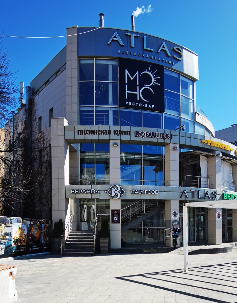 Изучив несколько ближайших к отелю ресторанов с постным меню, остановил свой выбор на ресторане итальянской кухни с простым и понятным названием «Веранда» (с рейтингом 4.8 на Яндекс.Картах на основе более 1200 оценок). Расположен он в самом начале пешеходной улицы города - улицы Волжская, в здании странной формы, в паре сотен метров от набережной Волги. За небесно-синими зеркальными стёклами по соседству разместились: ресторан-бар «МОНО», ресторан-клуб «Atlas», грузинский ресторан «Bakuriani». Вот такое место притяжения ресторанной силы Саратова.