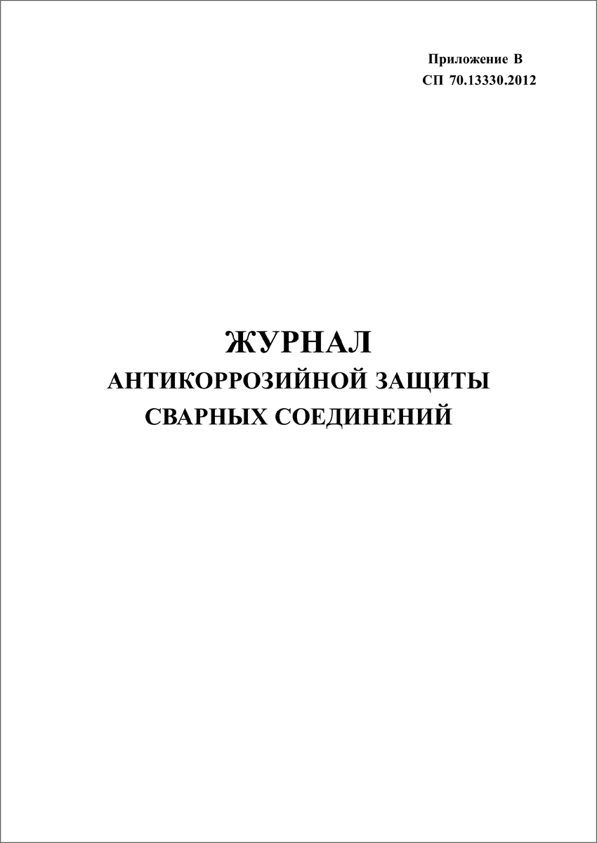 Нормативный документ: Приложение В СП 70.13330.2012 Несущие и ограждающие конструкции Титульный лист Наименование организации, выполняющей работы _______________________ Наименование объекта строительства ________________________________________ Должность, фамилия, инициалы и подпись лица, ответственного за выполнение работ по антикоррозионной защите сварных соединений и ведение журнала _________________________________________________________________ Организация, разработавшая проектную документацию, чертежи КЖ _______________________________________________________________________________________ Шифр проекта _____________________________________________________________________ Организация, разработавшая проект производства работ по антикоррозионной защите сварных соединений _____________________________ Шифр проекта ______________________________________________________________________ Предприятие, изготовившее конструкции _____________________________________ Шифр заказа __________