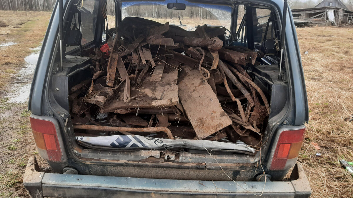 В этот день мы только с Саньком поехали, и машину свою я оставил у соседней деревни. Фоток мало, и практически буковки будут, потому что поздно поехали и времени мало было. И так я вам ещё про егеря не рассказал, которого встретил вчера. На квадрике ездил, угодья проверял. Я с ним разговорился. Он сам родом из Перми и говорит, что они просто плуг у трактора отпускали и подымали землю и собирали металл после трактора. Но у нас трактора нет, и потом будет запись, где мы как раз после бульдозеров подняли нехилый тоннаж. Там просто на приёмки чуваки о...ли. Но об этом позже. Сегодня речь пойдёт об этой же "Деревне в один двор". Вот тот металл, который мы собрали и перегрузили в мою тачку, и потом снова поехали металл дособирать. Следующее фото - уже второй заход, и потом мы ещё поехали уголок 100-й забирать на ферму, который Лёха не докопал. И мы не весь его забрали. Там метров 7 длиной он был, и надо было его пилить. Ещё нам опять егерь попался. Мы пообщались немного с ним и побежали угол