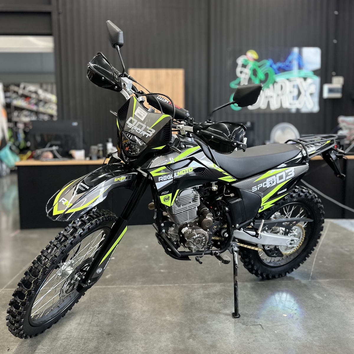 МОТОЦИКЛ REGULMOTO SPORT-003 PR (ЧЕРНЫЙ/ ЗЕЛЕНЫЙ) 179 900 ₽ ХАРАКТЕРИСТИКИ О ТОВАРЕ Regulmoto Sport-003 250 PR – обновленная версия одного из самых востребованных мотоциклов известного азиатского производителя ZF-KY. Доступный мотоцикл многоцелевого назначения в 2021 году получил ряд существенных изменений стоковой комплектации, которые положительным образом отразились на его техническом потенциале и возможностях повседневного использования. Опыт потребительской эксплуатации позволил Regulmoto Sport-003 продемонстрировать высокую надежность, простоту в управлении и неприхотливость в обслуживании этого современного мотоцикла. В раме обновленной модели байка теперь стоит более мощный одноцилиндровый 4-тактный двигатель объемом 250см3 ZS172-FMM-5 с воздушным охлаждением и 5-ступенчатой коробкой передач и балансирным валом. . Мотор последнего поколения Zongshen PR 172FMM-5, работая вместе с вакумным карбюратором, способен развивать максимальную мощность до 21 лошадиной силы. Среди других к