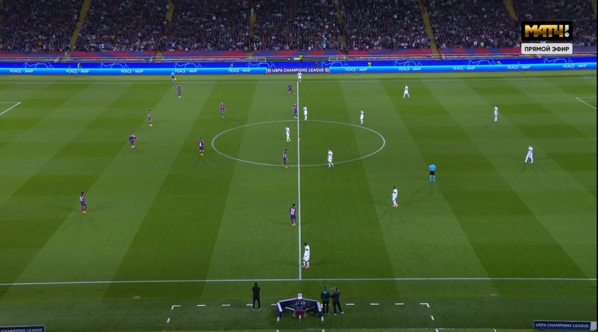 Барселона сразу пошла в прессинг, но он достаточно аккуратен. Они прессинговали в тех моментах, когда ПСЖ не сможет выйти пасом и провести быструю атаку, ведь у ПСЖ быстрые Мбапе, Дембеле и Барколя.