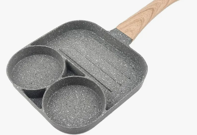 Было дело, заглядывалась я вот на такую сковороду, кажется, очень удобно ей пользоваться - как раз на двоих две аккуратные яичницы или омлета можно приготовить и рядом сосиски какие-нибудь поджарить или хлеб с сыром сделать, да много чего можно придумать.