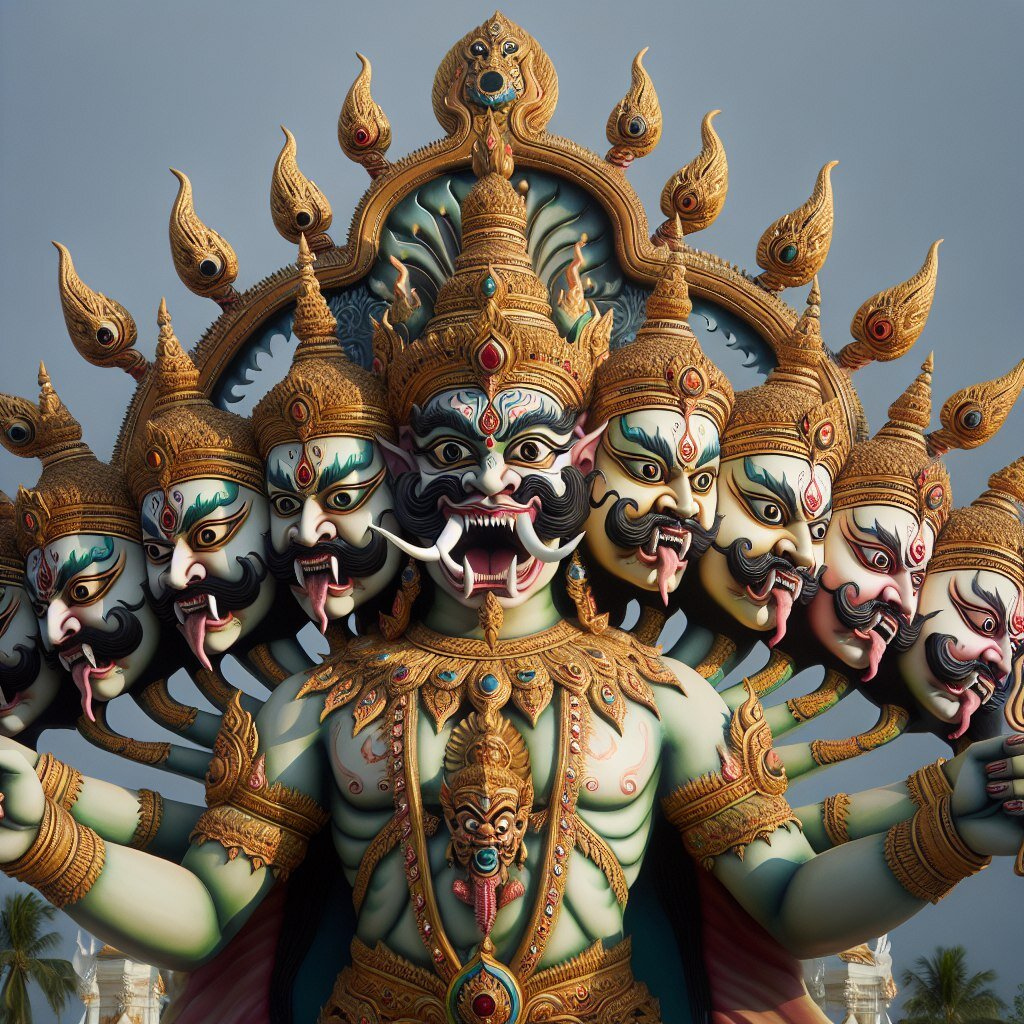 В индуистской мифологии великий демон, бывший повелитель ракшасов и владыка острова Ланка, известен как Равана. В эпосе "Рамаяна" он выступает в роли антагониста главного героя, Рамы, обладая десятью головами и прозвищем Дашагрива, что означает "Десятишеий". По легенде, Равана посвятил десять тысяч лет суровому подвижничеству и был наделен даром неуязвимости от богов и демонов своим прадедом Брахмой. Овладев властью над небесами, землей и подземным миром, он установил своё царство на острове Ланка, изгнав своего брата Куберу и заставив богов служить ему. Однако, чтобы покончить с тиранией Раваны, бог Вишну сошёл на землю в обличии Рамы по просьбе других богов. Равана похитил жену Рамы, Ситу, и удерживал её на Ланке. Рама и его брат Лакшмана, поддержанные царём обезьян Сугривой, сразились с ракшасами. Рама вступил в жестокий бой с Раваной, чьи отрубленные головы мгновенно отрастали. В конечном счёте Рама поразил Равану в сердце стрелой Брахмы, покончив с его злодеяниями.