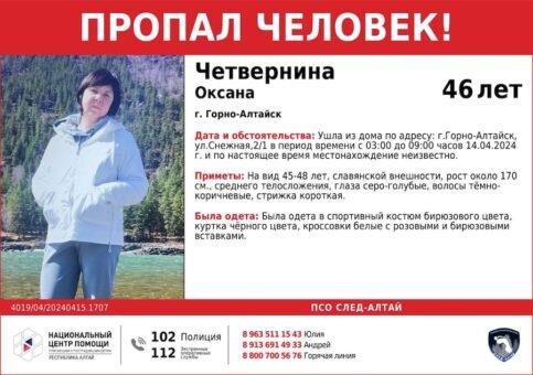 В республиканской столице бесследно исчезла 46-летняя женщина, следственные органы ведут проверку. По предварительным данным, в ночь с 13 на 14 апреля пропавшая ушла из дома по улице Снежной, домой не возвратилась, до настоящего времени о ее местонахождении ничего не известно. Организованные поиски женщины результатов пока не принесли, поисково-спасательные мероприятия продолжаются. Приметы разыскиваемой: на вид 45-48 лет, славянской внешности, рост около 170 см, среднего телосложения, волосы темно-коричневого цвета (окрашенные), стрижка короткая, глаза серо-голубые. На момент исчезновения на женщине была черная куртка, бирюзовый спортивный свитер, бирюзовые спортивные брюки или синие джинсы, белые кроссовки с бирюзовыми и розовыми вставками. Всех, кто располагает сведениями о судьбе пропавшей женщины, обстоятельствах ее безвестного исчезновения, ее местонахождении, просят незамедлительно сообщить об этом в следственный отдел по городу Горно-Алтайску СУ СК России по Республике Алтай по