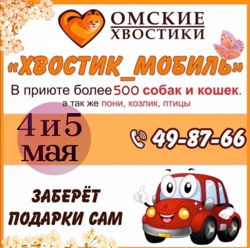 Хотите порадовать наших "хвостатых деток"?! Друзья, встречайте нашу традиционную и уже любимую акцию «ХВОСТИК-МОБИЛЬ»! 4 и 5 мая 2024 года с 11:00 до 19:00 наш Хвостик-мобиль будет ездить по городу и забирать ваши подарки подопечным приюта прямо из вашего офиса или дома. Если вы хотите помочь нам и порадовать наших "хвостатых деток", скорее принимайте участие в акции! У нас проживают более 500 животных! В приюте очень много питомцев на лечении. Так же особенные хвостики-инвалиды. Помимо кошек и собак у нас есть лошадка, козлик, кролики, хорьки и даже енотовидная собачка! И все они будут рады абсолютно любым подаркам! Например, нам всегда нужны: ВАЖНО! Для участия в акции вам необходимо оставить ЗАЯВКУ по КОНТАКТНОМУ ТЕЛЕФОНУ: