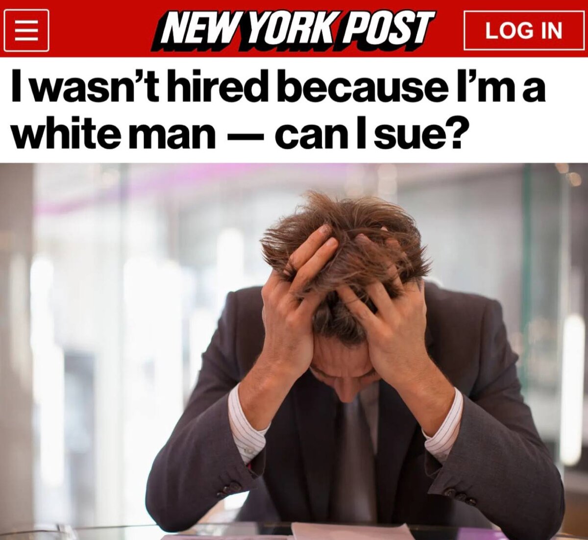 На Западе сплошь и рядом случаются удивительные вещи. Но даже в их ряду это событие стоит особняком, потому как, во-первых, вполне логично по сути своей, что уже невероятно, во-вторых, оно противоречит всем существующим установкам западной повесточки, но всё равно случилось. Данное событие стало настоящим тектоническим сдвигом в идеологической пространстве запада. Итак, о чём же речь? Случилось страшное! Белые поняли, что их угнетают! Да-да, те самые цисгендерные редиски, которых западная идеология считает главным источником зла на Земле, которые по определению не могут быть угнетаемыми, поскольку сами являются источником и главным инструментом угнетения, белые цисгендерные мужчины почувствовали дискриминацию! Притом не только почувствовали, но ещё и заявили об этом во всеуслышание со страниц газет! Какая наглость, а? Долго это, конечно, до них доходило, но радует, что наконец-то дошло. Суть вот в чём - белым мужчинам отказывают в приёме на работу, в повышении по карьерной лестнице и