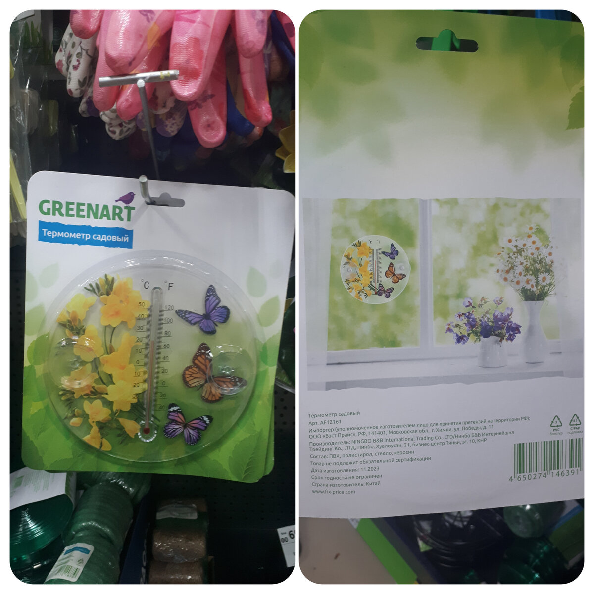 Термометр садовый стоимостью 116 рублей. Состав: ПВХ, полистирол, стекло, керосин. Страна изготовления Китай.