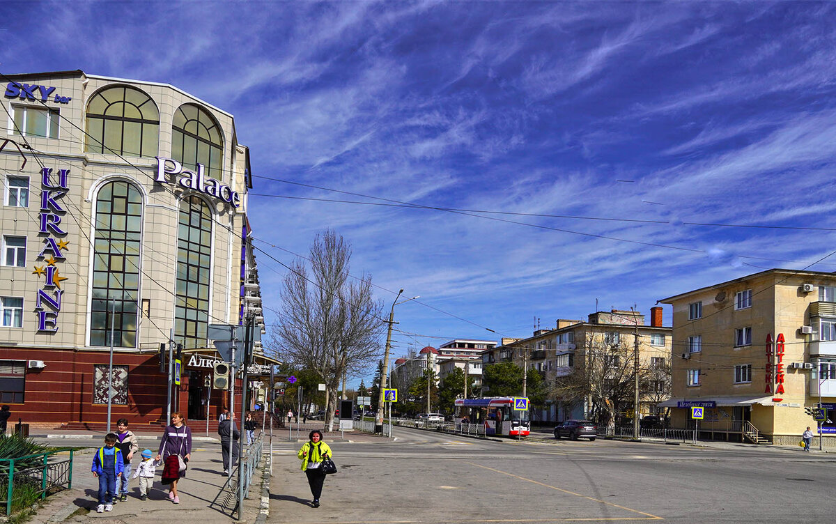 «Вернусь» из Сочи в Крым. В прошлые выходные мы прогулялись в Евпаторию. Поводов было несколько. Первый и главный - в Евпатории отремонтировали и открыли Набережную имени Валентины Терешковой. И было интересно посмотреть, что нового появилось. Но начали мы с прогулки по улице им. М. Фрунзе до моря, затем по улице им. Горького до улицы Дувановской и по ней в центр. Ну, а далее... Далее фоторепортаж. Набережная им. М. Горького ремонтируется. Доступа к «телу» Геракла нет. Поэтому он остался за кадром. На море было тихо. Плавали лебеди. Вдали виднелись крымские горы, находящиеся более чем в 80 километрах от Евпатории. Одинокий древнегреческий герой. Правда, не совсем одинокий. Рядом с ним периодически появлялись строители. Чатыр-Даг Побродив у моря мы вернулись на улицу им. М.Горького, идущую вдоль моря. Должен сказать, что эта часть Евпатории славна своей архитектурой. Каждый дом имеет свои особенности и по своему красив. Парк миниатюр. Кстати говоря - наконец взялись за реставрацию