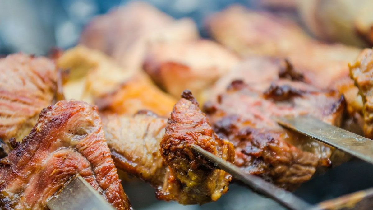 Шашлык в луковом маринаде Простой рецепт для настоящих ценителей. Идеально работает со свининой, особенно с шейкой. Неплохо получится и с говядиной, но это должен был очень нежный филейный кусочек. Необходимо нарезать мясо крупными кусками, репчатый лук измельчить. Лука понадобится много — на килограмм мяса до полкилограмма лука. Перемешать куски мяса с мелко порезанным луком и поставить в холодное место на ночь. Утром добавить специи: черный и душистый перец, кориандр, майоран. Лучше всего, если это будут свежемолотые специи. Перед тем, как вы станете нанизывать мясо на шампуры, добавьте в него соль. Делать это заранее не стоит, поскольку соль высушивает мясо. Для эстетики можно перемежевывать мясо на шампуре с кружками помидора или кольцами лука. В самом конце можно добавить эстрагон (тархун) или орегано — так как их аромат исчезает под действием жара. Ингредиенты: Мясо; Репчатый лук; Соль; Специи по вкусу, но черный перец и кориандр должны быть обязательно. Шашлык с французской горч
