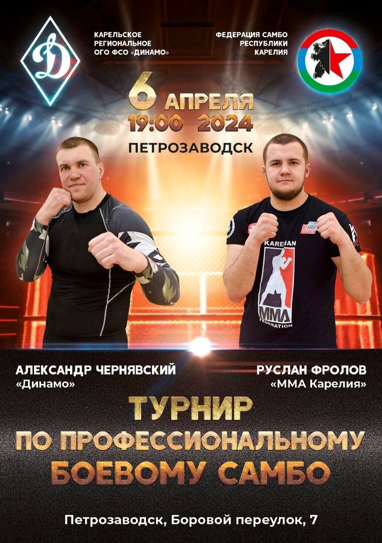 Мероприятие пройдет в ФОК "Динамо" в Петрозаводске 6 апреля. В паблике Общество «Динамо» рассказали, что 6 апреля в октагоне встретятся представители боевого самбо, ММА, панкратиона, тайского бокса, армейского рукопашного боя, грепплинга, дзюдо и поборются за звание сильнейшего по универсальным правилам профессионального боевого самбо.(16+) Главным событием турнира станет финальный бой, в котором сойдутся Александр Чернявский, кандидат в мастера спорта по дзюдо и самбо, чемпион Карелии по дзюдо и Руслан Фролов, чемпион России по кэмпо-мма, чемпион международного кубка Балтики по грепплингу Gi и No Gi, чемпион и призер Всероссийских турниров. Мероприятие пройдет в Петрозаводске по адресу: переулок Боровой, дом 7, ФОК «Динамо». Начало турнира — в 13.00. Торжественное открытие и начало финального блока — в 19.00. фото: Общество "Динамо" (Карелия) / ВК