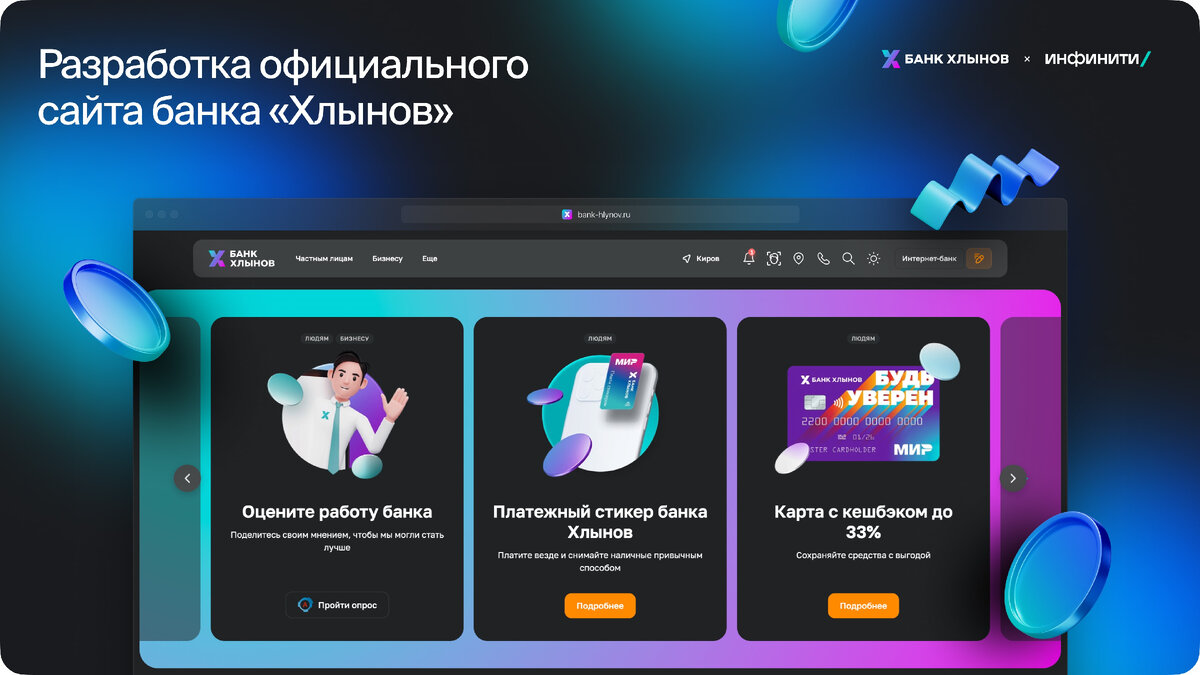 Разработать новый корпоративный сайт банка «Хлынов» в формате технологически удобного и современного финансового сервиса для действующих и новых клиентов банка.