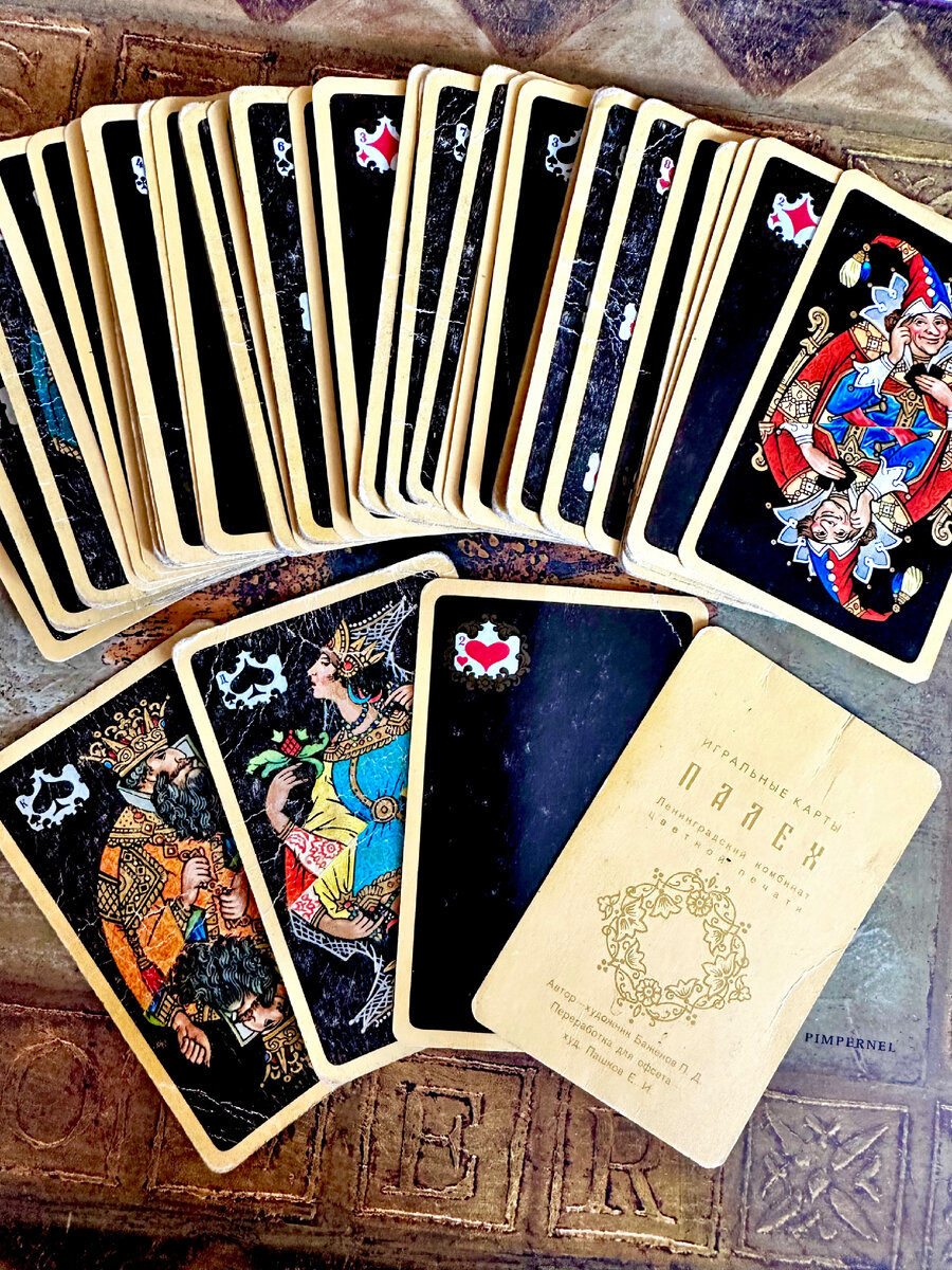 Иногда в старых вещах можно найти очень интересные предметы, вот и мы обнаружили старую колоду игральных карт от Ленинградского комбината цветной печати. Это оказалась колода "Палех", которая стала одной из лучших в истории отечественного карточного производства. Автором эскизов "Палех" был Павел Дмитриевич Баженов (1904-1941), родившийся в селе Подолино, неподалеку от Палеха, в семье иконописца. Хотя Павел также получил образование в иконописном искусстве, но ни одной иконы так и не создал. После революции вернулся в родную деревню, чтобы заняться земледелием и скотоводством, однако он никогда не переставал заниматься рисованием. В 1926 году Баженов стал первым учеником Артели древней живописи, организованной в Палехе. Его наставниками были Голиков и Баканов - старейшие мастера Палеха. С начала 1930-х годов баженовская техника живописи приобрела новый уровень мастерства и изысканности. Возможно, благодаря своей уникальной художественной технике Павел Дмитриевич Баженов привлек вни