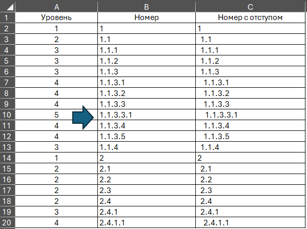 Сегодня хочу поделиться с Вами способом автоматизированного создания многоуровневой нумерации в excel. Как сделать нумерацию как в столбце B на основании информации в столбце A? Сейчас разберем подробно. Данная задача решается путем создания четырех условий: В ячейку B2 ставим 1, в ячейку B3 прописываем формулу на основании функции ЕСЛИ =ЕСЛИ (A3>A2; B2&".1"; ЕСЛИ (A3=A2; (ЛЕВСИМВ (B2; ПОИСК ("@"; ПОДСТАВИТЬ (B2;".";"@"; ДЛСТР(B2)- ДЛСТР (ПОДСТАВИТЬ(B2;".";""))))) & ПРАВСИМВ (B2; ДЛСТР(B2)- ПОИСК ("@";ПОДСТАВИТЬ (B2;".";"@"; ДЛСТР(B2)-ДЛСТР(ПОДСТАВИТЬ(B2;".";"")))))+1);