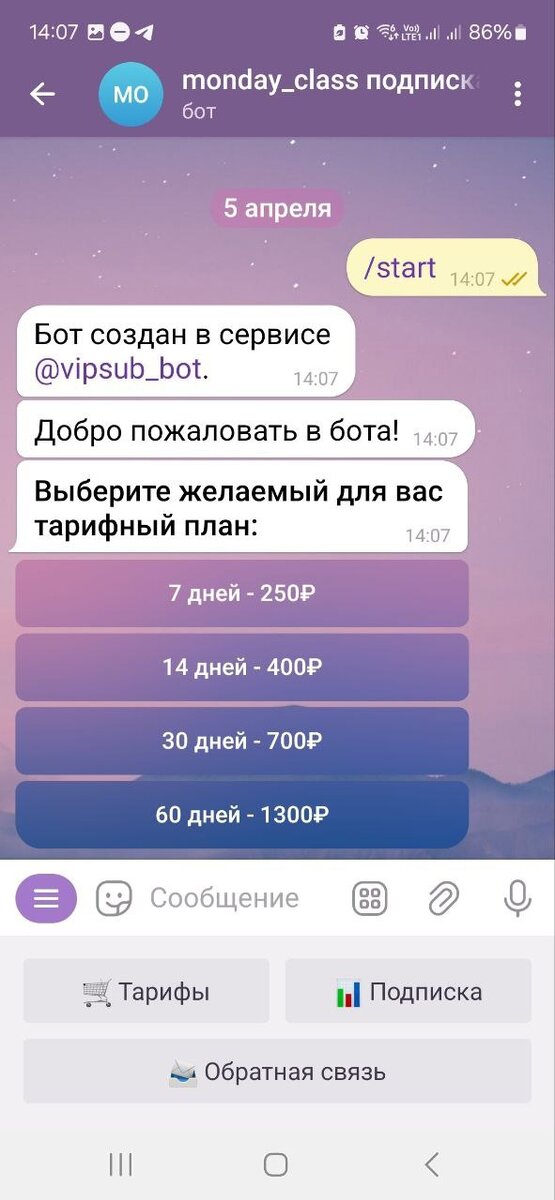 Статья-пояснение для тех, кто не в курсе, как это всё работает. Заходим в бота t.me/monday_class_bot Он позволяет получить доступ сразу ко всем еженедельным мастер-классам. Ознакомиться с их списком можно по ссылке t.me/monday_class_news Когда вы заходите в бота, вы видите кнопку Старт Нажмите её. Если кнопки нет, введите команду /start Далее необходимо выбрать тарифный план. Планы отличаются друг от друга только временем доступа сразу ко всем мастер-классам. Далее необходимо выбрать способ оплаты - на кошелек ЮМoney или на карту. Оплата на кошелек автоматическая (бот проверяет её сам), оплата на карту требует моего подтверждения. После выбора оплаты на карту (способ, который мне представляется более вероятным) бот сообщит реквизиты для оплаты, а внизу появится кнопка Я оплатил После оплаты её необходимо нажать. Бот запрашивает подтверждение оплаты. После получения квитанции (или времени платежа) бот запрашивает подтверждение уже у меня. Когда он его получает, он присылает ссылку-пригл