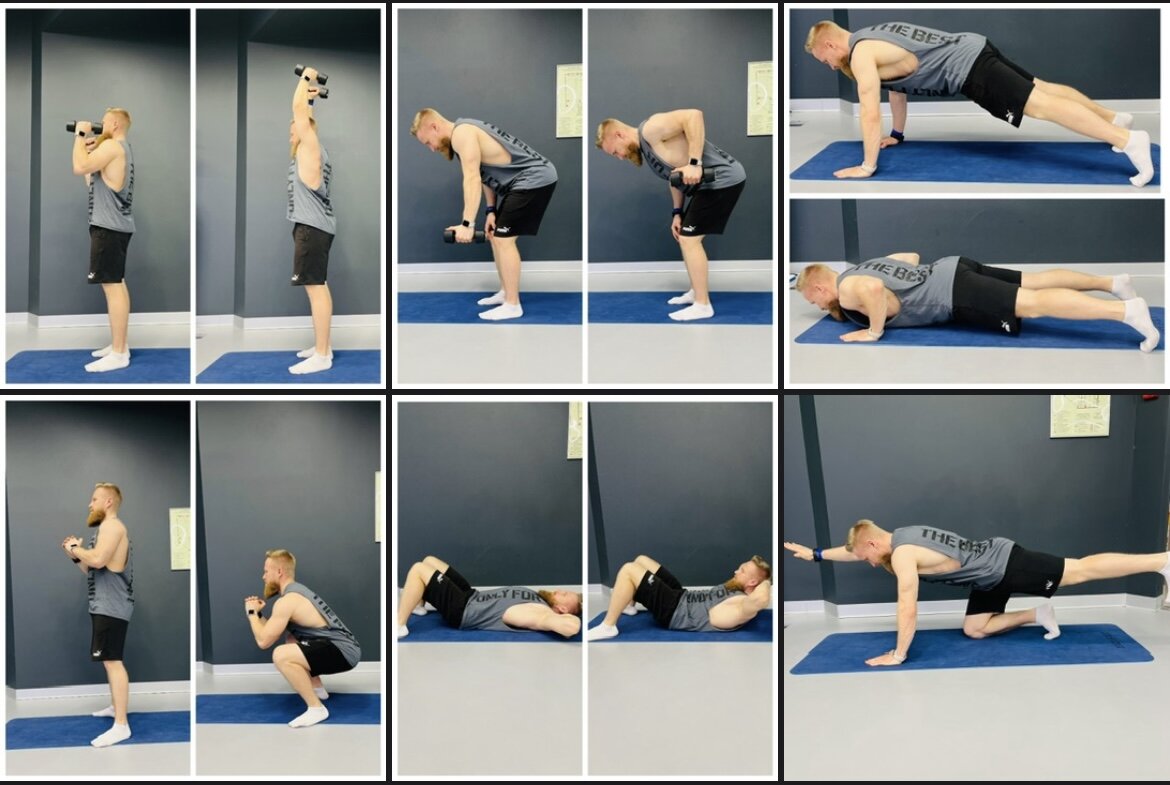 Подойдет как для начинающих так и для тех, кто уже знаком с физическими упражнениями. Такая тренировка, выполненная хотя бы 2 раза в неделю, добавит активности в течении дня, улучшит метаболизм, настроение, произойдет большее сжигание калорий, уберет застои в мышцах (особенно актуально для работающих на дому, где вся активность сводится к походам на кухню и в ванную). Для выполнения данного комплекса нам необходимо минимальное оборудование: гантели 2-5 кг. Если гантелей нет можно набрать в 2 литровые бутылки воды(обязательно с ручками). Принцип выполнения такой же. Прямые скручивания (прямая мышца живота). Исходное положение: лежа, ноги согнуты под углом ~90 гр, руки за голову, выполняем скручивание грудного отдела позвоночника, стараясь максимально приблизиться вперед , не отрывая при этом поясницу. Отрываются только лопатки, за шею себя не тянем. Выдох делается на усилие(скручивание), вдох при возвращении в исходное положение. Делаем 15 повторений в 3 подходах. Отды