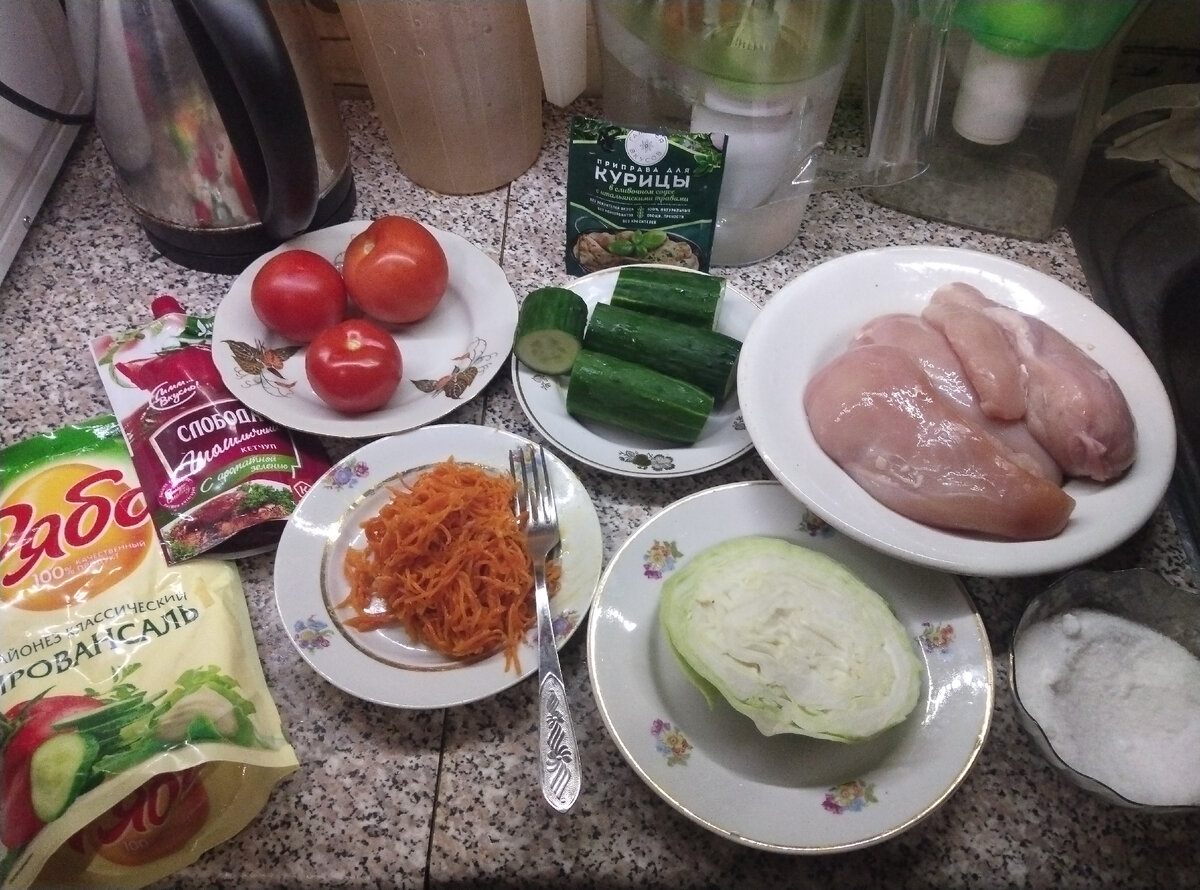 Ингредиенты: Лаваш армянский 2 шт. Куриное филе 3 шт (общий вес 900 гр.). Морковь по корейски 100 гр. Огурец свежий 217 гр. Помидор 178 гр. Капуста свежая 130 гр. Соль 1 ч.л. Приправа для курицы 3 ч.л. Растительное масло для маринада 3 ст.л. Майонез, кетчуп по вкусу. Способ приготовления: Огурец режем небольшой соломкой, помидор-на небольшие произвольные кусочки. Капусту нашинкуем, подсолим и пожмём, чтобы она дала сок и стала мягкой. Куриное филе посыпаем приправой для курицы, солью и растительным маслом. Втираем и оставляем на 30-40 минут пропитаться. Спустя время. Обжариваем филе целиком до готовности и красивой корочки. Нарезаем на небольшие кусочки, чтобы потом было удобно жевать. Разрезаем наш лаваш на 2 части. Берём одну часть и собираем нашу шаверму. С одного края намазываем майонез. Выкладываем огурцы и помидоры. Добавляем мягкую подсоленную капусту и мясо. Теперь добавляем морковь и смазываем кетчупом. Теперь заворачиваем края к середине. Закручиваем нашу шаверму. Слегка обжа