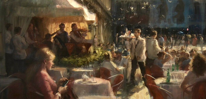 Художник Симон Пазини следует примеру Энгра, который утверждал, что «цвет придает картине декоративность, но это всего лишь вспомогательное средство...» Пазини родился в 1976 году в Генуе. Выпускник художественной школы Пио Манзу в Бергамо. Пазини получил классическое образование, он мастер фресковой техники, работал реставратором. Несмотря на то, что его творчество опирается на живопись прежних веков, Пазини остается очень современным во всех отношениях. Он отдает предпочтение интерьерам и городским сценам, в которых присутствуют люди, полностью погруженные в свои повседневные дела. На картинах Пазини нет четких линий, он предпочитает расплывчатые контуры, но мастерски переданы и жаркий средиземноморский свет, пробивающийся сквозь тенистую крышу из листьев, и залитая солнцем венецианская терраса, рыночные прилавки, залитые солнечным светом, люди на террасе, собравшиеся под сенью векового дерева. Картины, в которых сочетаются красота и спокойствие, и зритель задерживает дыхание в стре