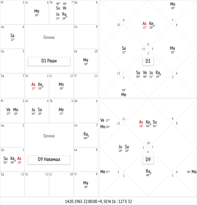 Обращаем внимание на Луну. Для женского гороскопа она особенно важна. Её природа здесь имеет воздушную природу. Таким образом, не смотря на сильное положение Марса, Вата-качества всё же берут верх над огнём. Что также подтверждает Навамша. Здесь асцендентом управляет Сатурн, расположенный в кендре и опять же аспектирующий лагну. Сатурн находится в огненном знаке, что поддерживает влияние огня на конституцию, однако сам Марс расположен в сухом знаке Девы, поэтому с годами яркие огненные качества в человеке будут всё менее проявлены. В отличие от водных, сила которых может заметно усилится. В Навамше Венера и Луна занимают знак Рыб, сам Юпитер в кендре с лагнешем. То есть в старшем возрасте обладатель карты станет более уравновешенным, спокойным, мудрым, терпеливым. Основной же аюрведической конституцией остаётся Вата-Питта. Мы говорили о ней здесь https://dzen.ru/a/ZfEbQW-KOlZH7_Mg?share_to=link