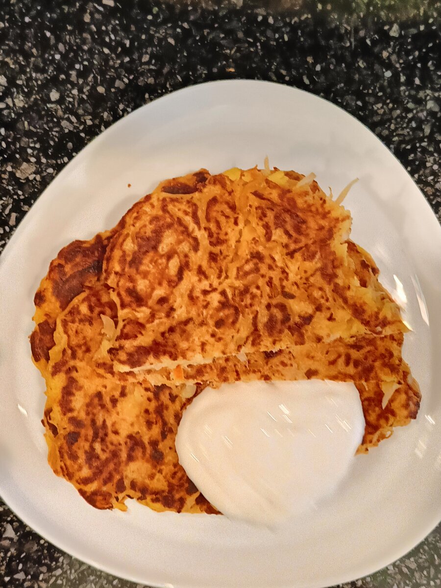 Солнечно-витаминные, вкусно-незаморочные получились лепёшки. Продуктов надо минимум,они всегда есть в холодильнике. Обжарила луковицу. Туда же закинула морковь. Остаток капусты. Потушила овощи до готовности.Посолила,поперчила,припорошила итальянскими травами. Пока овощи остывали, приготовила само тесто.Взяла полбутылки кефира (домочадцы уже отказывались допивать). Добавила яйцо ,соль,соду. Муки сыпанула на "глаз".Так чтобы тесто средним получилось- и не жидким и не густым.Перемешала,дала тесту чуток настояться. Соединила остывшую овощную начинку и тесто.Густенько получилось. Жарила без масла, сковорода позволяет. Обжарила одну сторону,немного под крышкой потушила. Повторила такую же операцию с другой стороны. Очень вкусные получились лепёшки.Мне они холодные больше нравятся. Приятного аппетита ! Готовим дома ! Готовим вкусно !