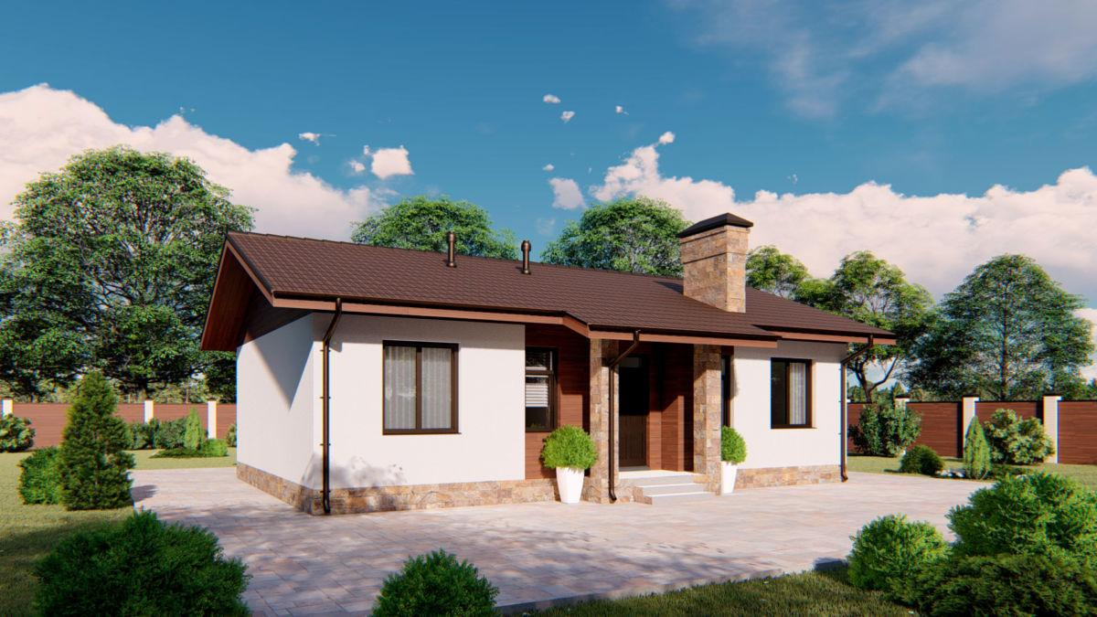 Проект одноэтажного дома, разработанный в современном стиле. Внешние габариты сооружения составляют11 на 10 м, общая площадь достигает 72 кв. м. В этом рационально организованном и уютном доме предусмотрены все необходимые помещения для комфортного проживания: просторная терраса, две спальные комнаты и совмещенная кухня-гостиная. Для всех домочадцев созданы оптимальные условия для отдыха, работы и развлечений, что достигается благодаря продуманной планировке и качественному внутреннему интерьеру. Данный проект можно адаптировать как для расположения в городской черте, так и в любом загородном населенном пункте.
