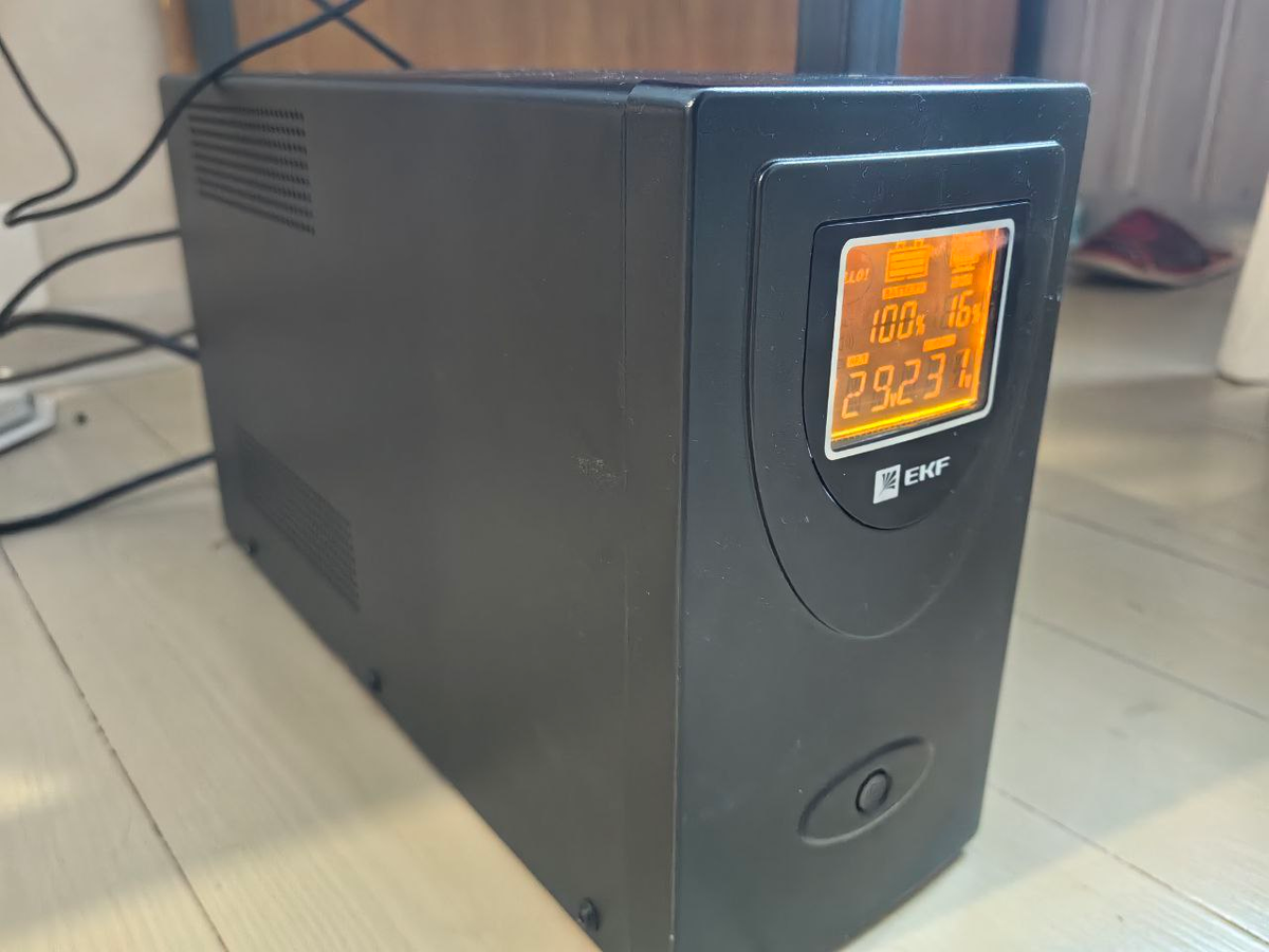 Теперь же я взял потестировать линейно-интерактивный ИБП российского производства – EKF SSW 2200 на 2000 ВА и 1200 Вт. А линейно-интерактивный ИБП отличается от резервного наличием регулятора напряжения на входе. Зачем он нужен? Затем, что в этом случае при просадках напряжения в сети, что за городом тоже часто происходит, ИБП не переключается сразу же на батареи, как резервные устройства, а стабилизирует его. При скачках напряжения аналогично: резервный ИБП честно «передаст» повышенное напряжение дальше, а линейно-интерактивный сгладит этот импульс.