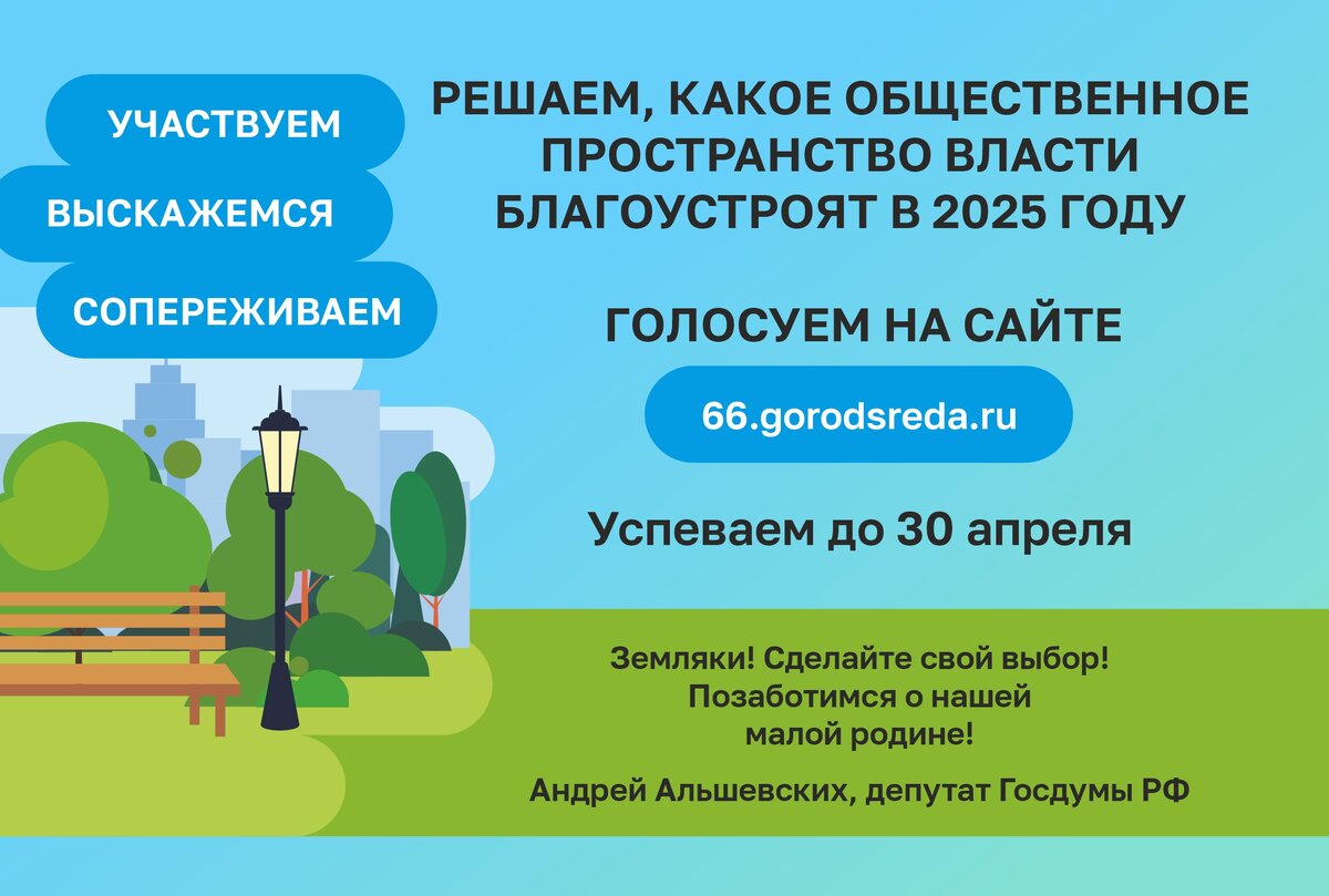 Достаточно поучаствовать во всероссийском голосовании за благоустройство. От нас зависит, какое общественное пространство в каждом муниципалитете реконструируют в 2025 году. В Екатеринбурге между собой «соревнуются» восемь территорий: 🔸бульвар по ул. Посадской; 🔸бульвар по ул. Культуры; 🔸парк 50-летия ВЛКСМ; 🔸 Метеогорка; 🔸 парк Семь Ключей (родной для меня, мой приоритет очевиден); 🔸Основинский; 🔸Солнечные аллеи; 🔸 Преображенский парк (вторая очередь, второй этап). В Верхней Пышме – не меньше претендентов на перемены: 🔸 аллея по ул. Кирова в пос. Кедровое; 🔸 Петровский бульвар (вторая очередь); 🔸 сквер Победы в пос. Исеть; · пространство возле ул. Набережной в Балтыме; 🔸 «Мостовской круиз», с. Мостовское; 🔸 Петровский бульвар (первая очередь); 🔸 набережная, пос. Красный. В Среднеуральске решать проще: 🔸 городской парк; 🔸 мыс Веселый. Сделать выбор можно до 30 апреля (!) на сайте 66.gorodsreda.ru.