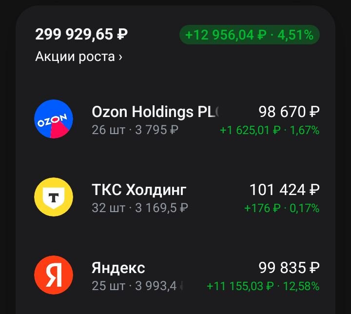 ИНВЕСТИЦИИ ВМЕСТО ИПОТЕКИ. ПЕРЕЗАГРУЗКА ПРОЕКТА. Вообщем, ребята, хочу вам признаться, что эта моя идея придумать себе долг за те года, когда я забрасывал этот проект, мне надоела. Хоть этот долг был и придуманный, долг самому себе, но он на меня давил как настоящий)) Короче, я себя простил и вместе с собой и простил свой бредовый долг самому себе. НАЧИНАЮ С ЧИСТОГО ЛИСТА! Добил до 100к акции Яндекса. Купил на 100к ТКС Купил на 100к акций Озона. На все 300к ровно не получилось купить, осталось чуть больше 2000р, докину эти деньги в течении недели в ту компанию, что сильнее других отстанет. Все, наигрался, никаких больше поисков точек входа. Тупо буду каждый месяц пополнять портфель на 15000р и докупать на них акции этих трех компаний. ПО ЛЮБОЙ ЦЕНЕ! Буду стараться держать равный баланс этих компаний в портфеле исключительно за счет пополнений (никаких продаж) т.е чьи акции больше всего будут отставать, тех и больше буду докупать. Теперь напомню старым подписчикам и расскажу новым чи