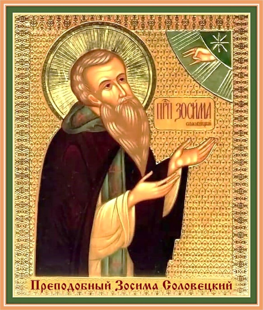 Преподобный Зосима родился в селе Толвуе на Онежском озере. Он воспитывался в благочестивой семье и принял монашеский постриг ещё в юном возрасте. Став монахом, Зосима раздал всё свое наследство нуждающимся и отправился на Белое море в поисках уединённого места для отшельничества. Там он встретил преподобного Германа, вместе с которым они отправились к Соловецким островам. В 1436 году отшельники построили там кельи и церковь, и начали возделывать землю. Осенью преподобный Герман отправился на материк за всем необходимым, но не смог вернуться из-за непогоды. Преподобный Зосима провёл на острове один всю зиму. Только помощь Господа не позволила подвижнику умереть от холода и голода. Весной вернулся преподобный Герман и привёз запас еды и рыболовные снасти. Скоро на острове стали собираться и другие подвижники. Для них был прислан игумен из Новгорода. Так было положено начало знаменитого Соловецкого монастыря. Но настоятели из Новгорода не задерживались на Соловках из-за сложных условий