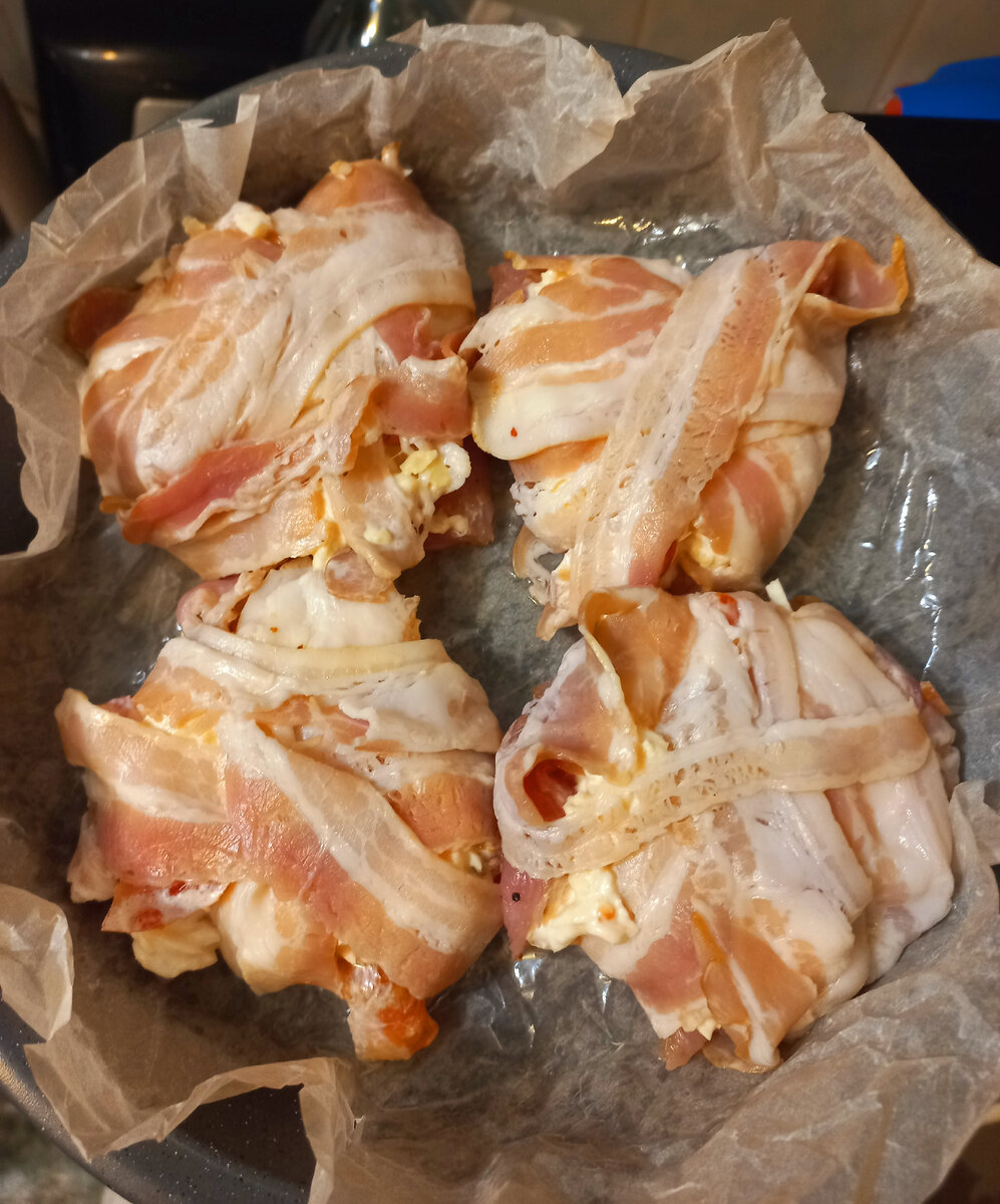 Один из моих любимых рецептов. Чем то напоминает мясо по французски. Ингредиенты: Индейка- 400 г Сыр твеодый- 150 г Майонез- 2 ст. л Чеснок- 1-2 зубчика чеснока Бекон- 200 г(одна упаковка) Соль, перец по вкусу. Приготовление: 1. Индейку разделать на стейки. Стейки отбить, но не сильно. 2.поперчить, посолить с двух сторон, можно добавить любимые специи. 3. Приготовим начинку, сыр натереть, добавить тертый чеснок и майонез, перемешать. 4. На индейку выложить по 1- 2 ложки сыра с чесноком. 5. Обернуть готовое мясо беконом и выложить на противень . 6. Выпекать при температуре 180° 40-45 минут. Наша индейка готова! Подавать с овощами , любимым гарниром. Мясо получается не сухое за счет бекона , сочное и очень вкусное идеально подойдёт для праздничного стола.
