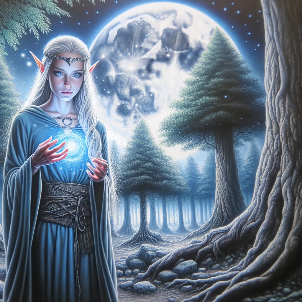 В древнем мире Эларион, где ветер шепчет древними секретами среди величественных деревьев, жила эльфийка по имени Ариэль. Её домом был Лунный Лес, место, где магия текла так же естественно, как реки текут к морю. Как хранительница священного источника, Ариэль знала каждый шёпот листьев, каждый шорох под лунным светом.