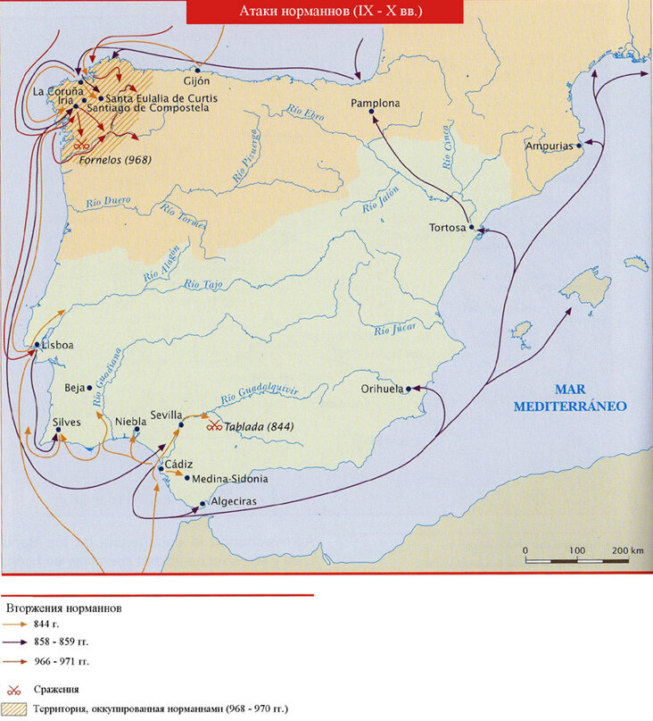Многие из вас, вероятно, слышали о нападении русов на Андалусию в 844 году, которое приписывается норманнам, хотя арабский географ и историк Аль-Якуби, умерший в 897 году в своей «Книге стран», называет нападавших ал-Маджус ар-Рус: «Западнее города ал-Джазира (находится) город Ишбилийа (он расположен) на большой реке; эта река Куртубы. В этот город в 229 году вторглись ал-маджус, которых называют ар-рус» Кстати, об этом нападении русов известно и арабскому географу Аль-Масуди жившему в 896-956 годах и вот что он пишет: «Русы составляют многие народы, разделяющиеся на разрозненные племена. Между ними есть племя, называемое Лудана, которое есть многочисленнейшее из них; они путешествуют с товарами в страну Андалус, Румию, Кустантинию и Хазар». Вторжению русов в Андалусию предшествовало разорение ими берегов Галисии, после чего в августе 844 года они, приплыв на 54 судах захватили Лиссабон. А затем русы напали на Кадис, и чуть позже поднявшись по реке Гвадалквивир, разорили Севилью (Ишбил