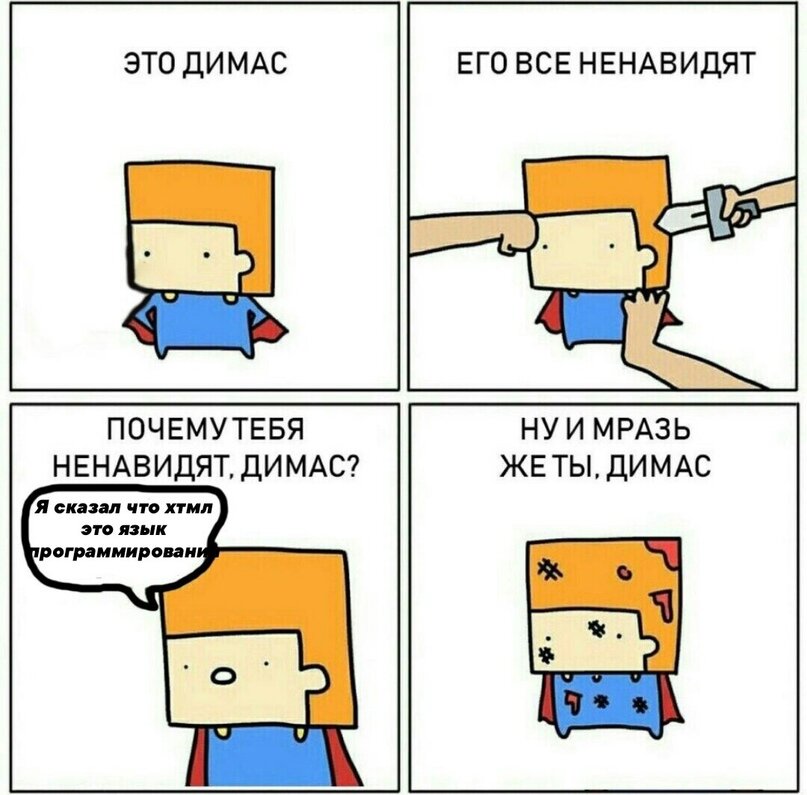 Я думаю многие любят почитать или посмотреть свои любимые мемы, но что же делать программистам? Спросите вы. Специально для этого я составил подборку 5 лучших мемов про программирование 1. Я думаю у кого опыт в кодинге больше пол года, знают что HTML это не ЯП. Я готов сделать такое с каждым, который это скажет. 2. Мне кажется, что каждый кто был в IT, так или иначе сталкивался с этими ЯП. Лично я со всеми тремя. Но сейчас в основном пишу на Python. 3. Это чувство самое бесячее, потому что в этот момент хочется и орать на автора урока и на создателя ЯП. А потом оказывается, что ты пишешь не на той же версии ЯП, что и автор. 4. Все кто писал на JS, знает что это за конструкция. Сначала кажется, что это херь ненужная, но когда пробуешь, то не понимаешь как раньше без этого жил. В python есть подобная на конструкцию в JS, называется try/except. 5. Я думаю многие кто пишет back-end часть, никогда в жизни не захочет учить CSS. Потому что, а зачем? Вывод: Вот такая подборка мемов про програ