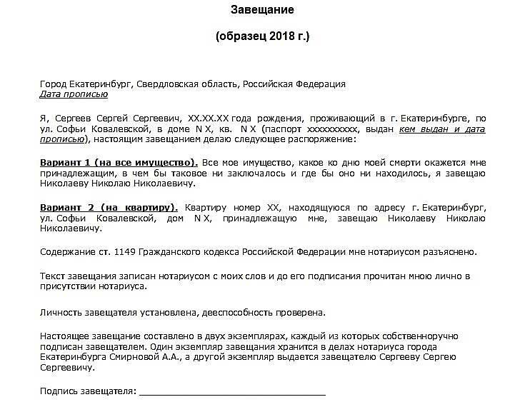 Образец завещания.