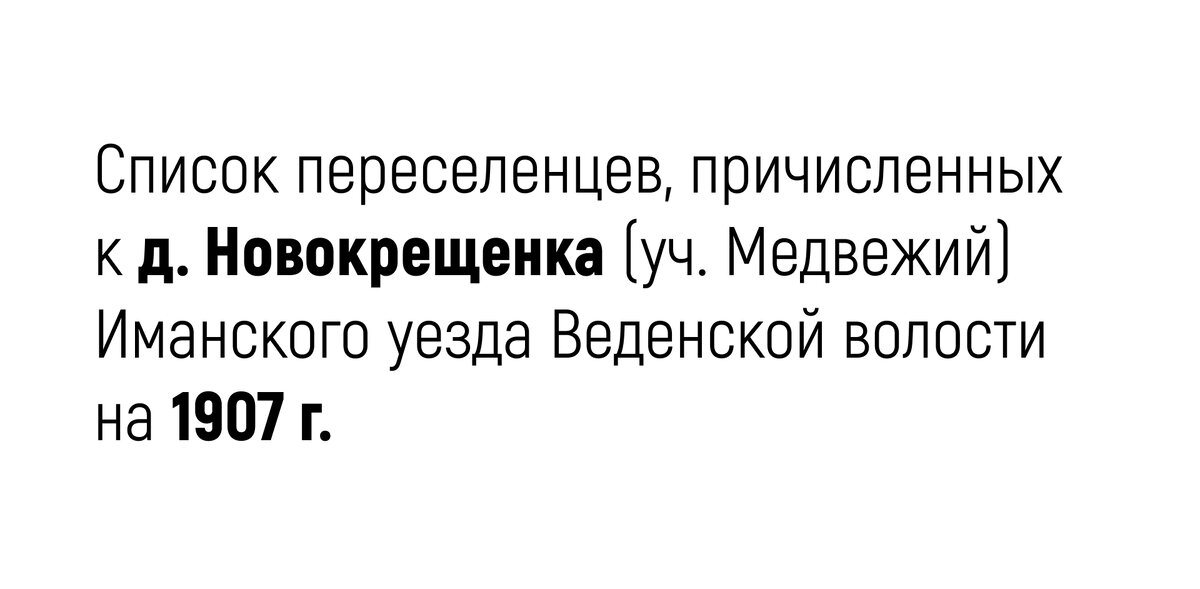 Ниже привожу список переселенцев, причисленных к деревне Новокрещенка (уч. Медвежий) Иманского уезда Веденской волости в 1907 г.