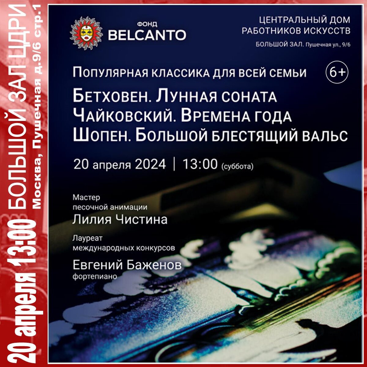 Популярная классика для всей семьи. «Бетховен. Лунная соната. Чайковский. Времена года. Шопен. Большой блестящий вальс» Произведения, которые прозвучат в этом концерте, относятся к самым узнаваемым сочинениям трёх великих композиторов. Соната №14 Людвига ван Бетховена, более известная как «Лунная соната», самим автором воспринималась как сочинение «в духе фантазии». Фантазия же музыкального критика Людвига Рельштаба уже после смерти автора позволила ему сравнить это произведение с «лунным светом над Фирвальдштетским озером». Знаменитое сочинение посвящено юной графине Джульетте (Юлии) Гвиччарди, которой в 1801 году Бетховен давал уроки музыки. Большой блестящий вальс (ор.18), первый из семнадцати вальсов Фредерика Шопена, был написан в 1831 году и также посвящён одной из учениц великого романтика. Вальс, покоривший Европу в первой трети ХIX века, в творчестве Шопена перестаёт быть просто популярным танцем. Его вальсы поэтичны, изящны, виртуоз