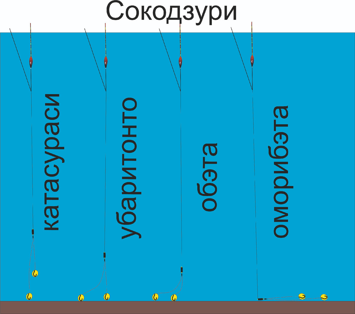 Азиатская поплавочная удочка - это снасть очень разноплановая. В каждой стране свои условия ловли и снасти немного отличаются. Но поскольку развитие этой ловли пошло из Японии, то там классификация максимально подробная и точная. Вот, например, варианты только лишь тех оснасток, в которых приманка касается дна: