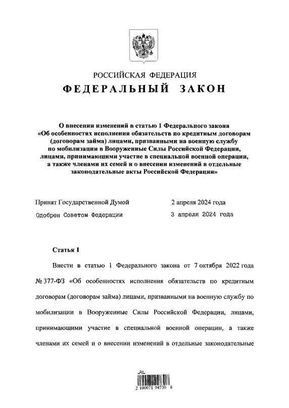 Президент России Владимир Путин подписал Федеральный закон «О внесении изменений в статью 1 Федерального закона "Об особенностях исполнения обязательств по кредитным договорам (договорам займа) лицами, призванными на военную службу по мобилизации в Вооруженные Силы Российской Федерации, лицами, принимающими участие в специальной военной операции, а также членами их семей и о внесении изменений в отдельные законодательные акты Российской Федерации"».