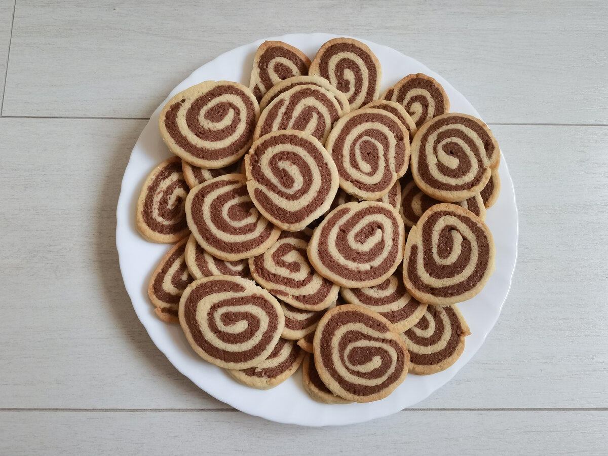 масло сливочное - 150г. сахар - 150г. ванильный сахар - 10г мука - 400г. яйцо - 2 шт. разрыхлитель - 1/2 ч.л. для теста какао порошок - 3 ст.л. Масло заранее достать из холодильника, чтобы оно успело согреться и стать мягким. Растереть масло с сахаром (обычный и ванильный) до однородности. По одному добавлять в масляную смесь яйца, тщательно перемешивая после каждого добавления. Добавить муку и разрыхлитель. Постепенно, добавляя небольшими порциями, примешать муку к масляной смеси. Хорошо вымесить тесто, лучше всего руками. Разделить тесто на 2 равные части. В одну часть добавить какао и перемешать. Оба куска теста раскатать в пласты примерно одинакового размера толщиной не более 5 мм. Когда пласты теста будут готовы, положить один на другой и свернуть рулетом. Завернуть рулет в пищевую пленку и убрать в морозильник на 20 минут, чтобы тесто немного затвердело, и его было удобнее нарезать. Заранее разогреть духовку до 180С. Затвердевшее тесто достать из морозильника и разрезать