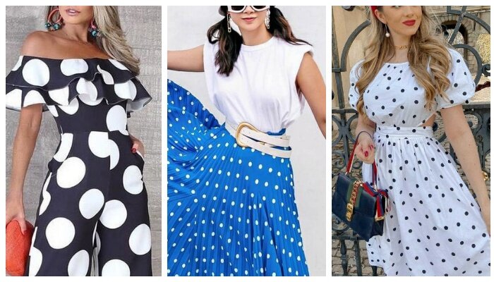 Стилисты рекомендуют носить платья в горошек с беретами, обручами, громоздкими цепями, стильными клатчами, а также женственными туфлями или же лоферами на тракторной подошве.