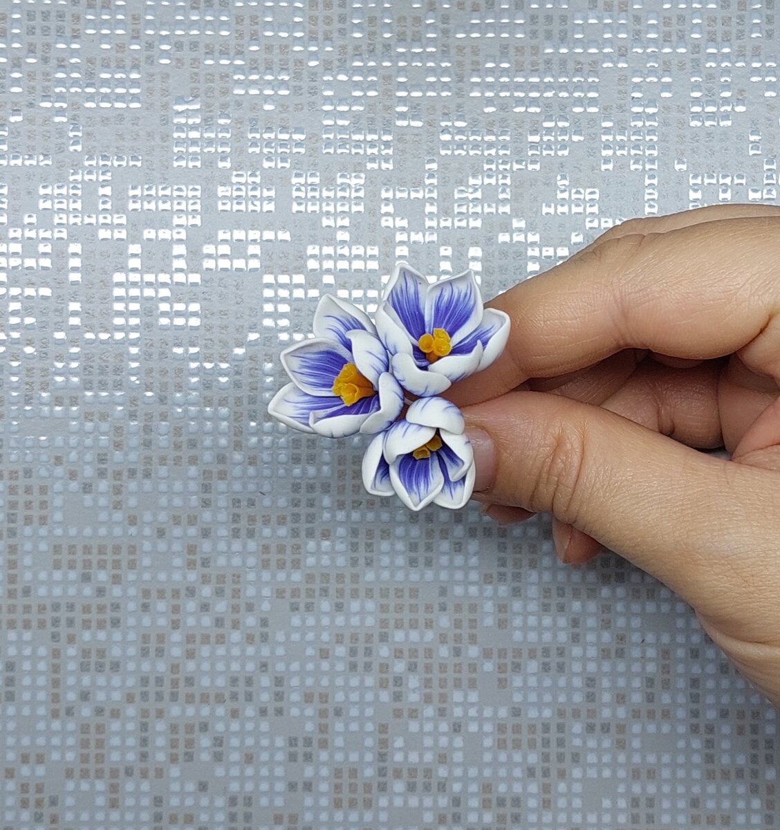 Фото-урок. Добрый день! Предлагаю посмотреть фото-урок по лепке крокусов. Начнём с тычинок. Для этого нам понадобится полимерная глина оранжевого цвета. У меня это Артефакт тыквенный. Также нам понадобится флористическая проволока в бумажной оплетке. Отрезки проволоки примерно 4см. Раскатываем глину в колбаску и нарезаем на отрезки примерно 2 на 2 миллиметра. Скатываем капельку. Стеком делаем углубление в капельке. И дотсом утончаем край тычинки, делая его волнистым. Нам необходимо 3 тычинки на цветок. Далее нам понадобится термоклей. Обмакиваем проволочку в термоклей. Необходимо, чтобы термоклеем было покрыто примерно 3-4мм. И приклеиваем тычинки к проволочке. Желательно, чтобы все тычинки были на одной высоте, без явных перекосов. Подрезаем немного тычинку, выравнивая нижний край. И отправляем запекаться) Приступаем к лепесткам. Нам нужна фиолетовая и белая полимерная глина. Белой глины берем немного больше. Делаем из глины цилиндры и разрезаем, белую глину на 5 частей, а фиолето