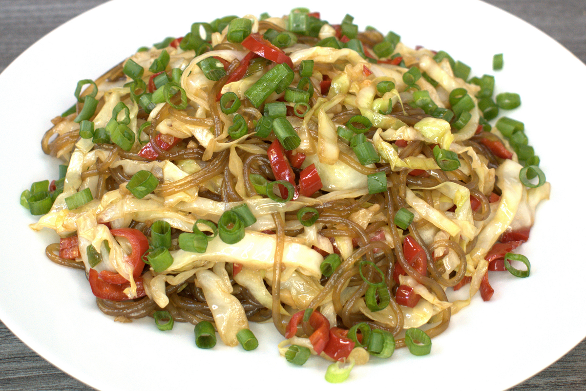 Ингредиенты: капуста 300 г (желательно молодая, она быстрее готовится) перец чили 2 шт. чеснок 3 зубчика зеленый лук (зеленая и белая часть по отдельности) свиной жир несоленый бататная фунчоза 120 г соевый соус 2 ст. л. тёмный соевый соус 1 ст. л. устричный соус 1 ст. л. соль 1 ч. л. давленый кубик куриного бульона 1/2 ч. л. сахар 1/2 ч. л. Процесс приготовления: Нарезать капусту тонкими длинными ломтиками. Удалить семена у двух перцев чили и нарезать их маленькими кусочками. Раздавить и измельчить 3 зубчика чеснока. Нарезать белую часть зеленого лука. Вскипятить воду в кастрюле. Добавить 1 ч. л. соли. Отварить бататную фунчозу, откинуть на дуршлаг, переложить в миску, добавить тёмный соевый соус, перемешать. Налить в вок немного растительного масла, нагрев средний, добавить несколько кусочков несоленого свиного сала, вытопить его, шкварки удалить. Обжаривать лук, чеснок и чили 30 секунд, добавить капусту, жарить до почти полной готовности капусты. Добавить сахар, давленый к