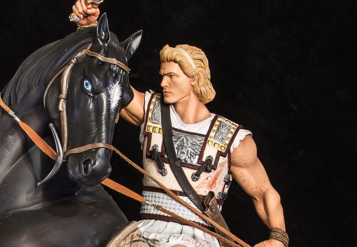 Буцефал-это имя знаменитого коня, который принадлежал Александру Македонскому. Конь получил это имя от самого Александра, так-как у животного было на черном лбу белое пятно, которое своей формой напоминало бычий череп, Буцефал с греческого значит «бычья голова». Буцефал был крупнее чем другие лошади, у него был черный окрас и один из глаз голубой. Отец Александра, царь Македонии Филипп II, подарил его сыну. Царь купил его за 13 талантов (большая сумма в то время), но со временем разочаровался в покупке, этот конь показал себя, как совершенно неуправляемый и казалось, что приручить его не получится. Как гласит легенда, обуздать коня смог только Александр, когда ему было 12 лет. Александр наблюдал, как другие пытаются оседлать Буцефала, и понял почему это не удается. Животное пугала собственная тень перемещаясь по земле. Юный наездник повернул коня, чтобы тот не видел тень и долго гладил его, после этого резко прыгнул на него, и он покорился. В итоге Буцефал привязался к Александру и ста
