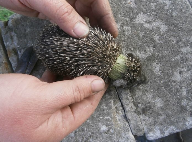 Вот об неё ежик и шкрябался своим пластиковым «ошейником». Какой идиот надел на него это – загадка.