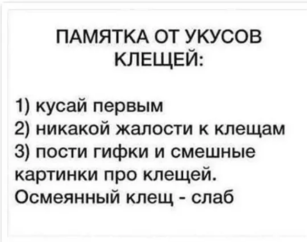 Отвыкла я от клещей за 24 года жизни на Крайнем Севере, тут их нет. Змей и комаров тоже нет, только мошкА в лесу. Помню, в детстве, мы с дядей ходили на рыбалку, после друг с друга снимали до 40 штук клещей. Не было, на моей памяти, проблем у кого-то от укуса клеща. Клещи были не страшные, кусали, конечно, но был один страх: только бы в ухо не залез.