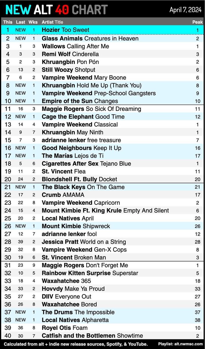 HOZIER с песней "Too Sweet" стартует с первого места. НОВЫЕ СИНГЛЫ GLASS ANIMALS, KHRUANGBIN, VAMPIRE WEEKEND, EMPIRE OF THE SUN, CAGE THE ELEPHANT, GOOD NEIGHBOURS и THE MARÍAS также дебютировали в ТОП-20.